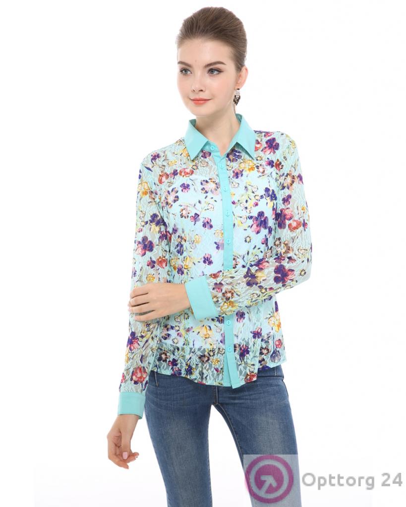 Нарядная женская блузка нежного ментолового цвета с цветочным принтом. Модель имеет длинные рукава. Воротник, манжеты и планка отделаны однотонными оборками.