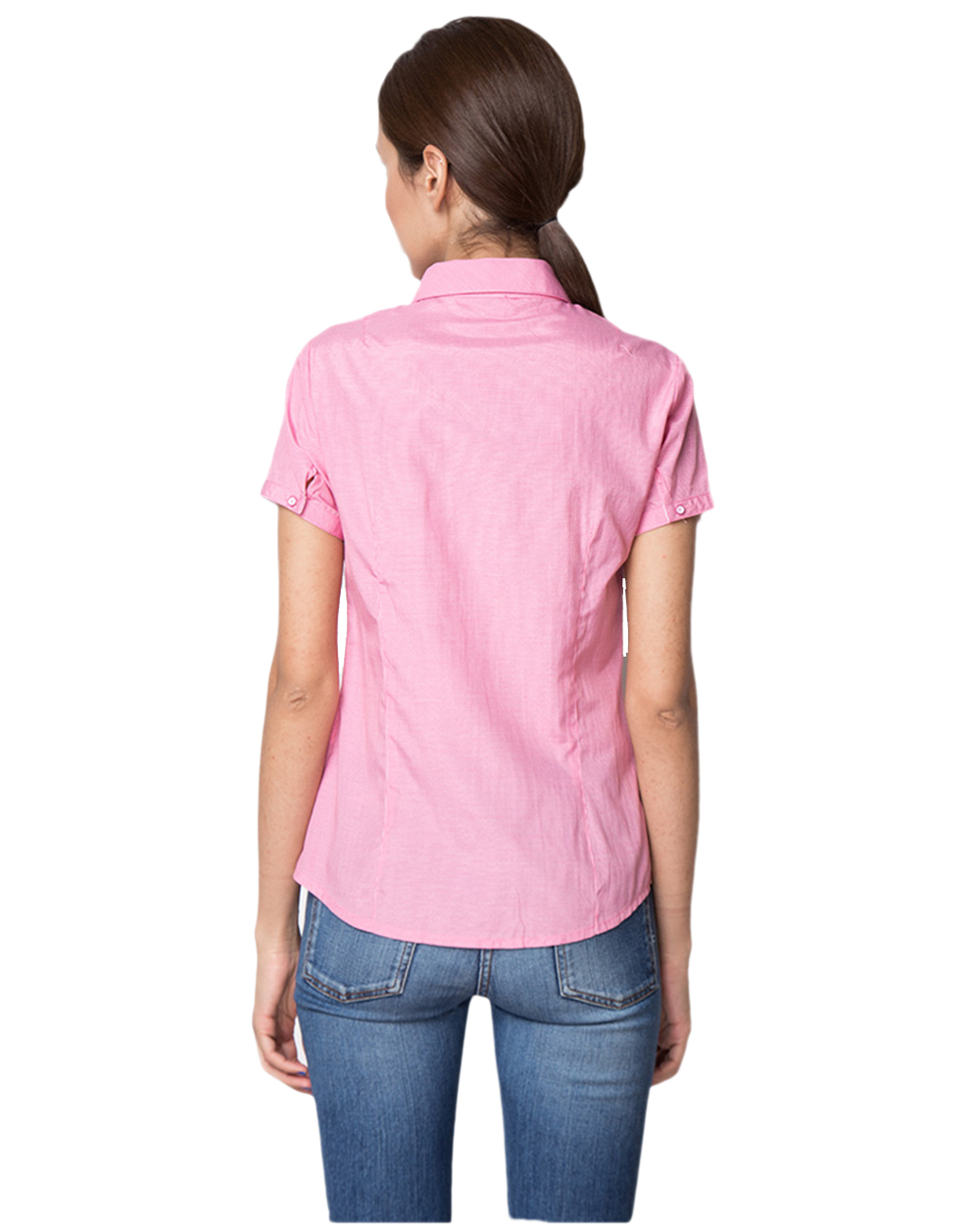 Легкая розовая блузка их хлопка. Приталенный крой, короткие рукава.