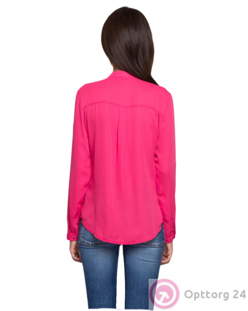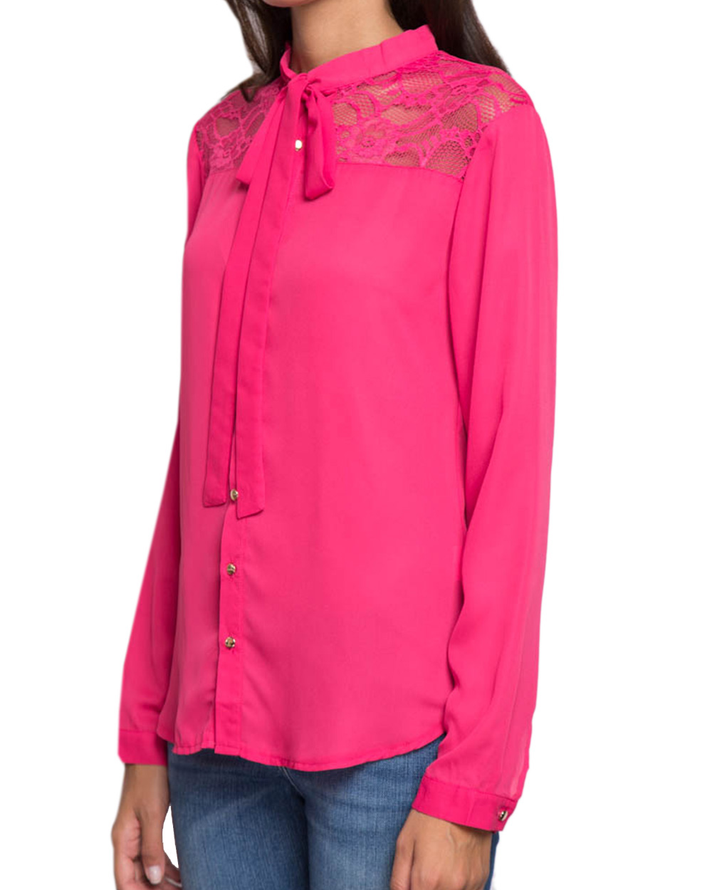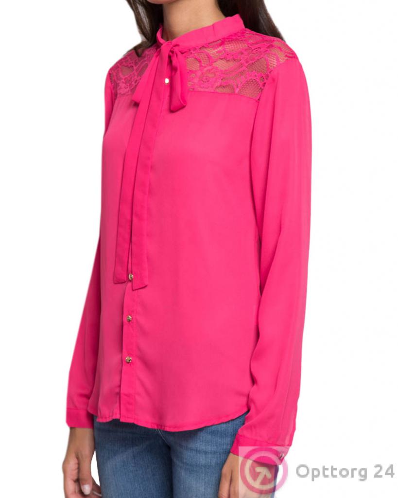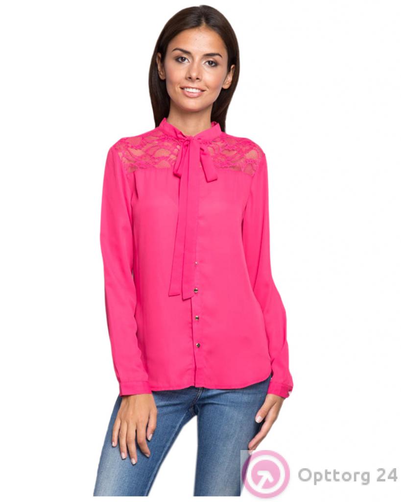 Женская блузка яркого розового цвета с кружевными вставками тна плечиках. Спереди воротник переходит в две ленточки, котрые можно завязывать на бант.
