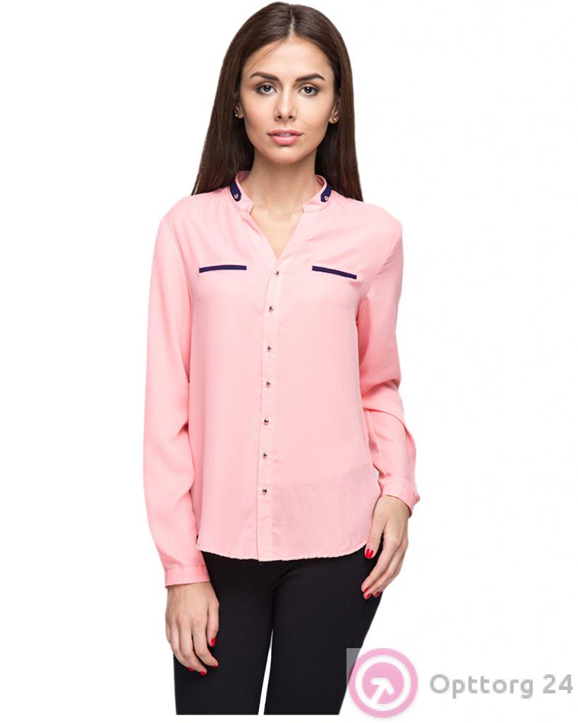 Стильная полуприталенная блузка с воротником-стойкой и имитацией врезных карманов на груди. Модель имеет длинные рукава.