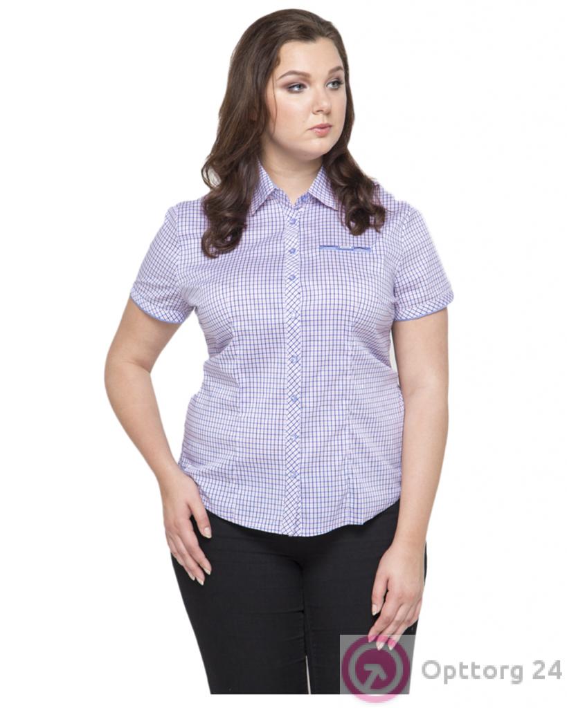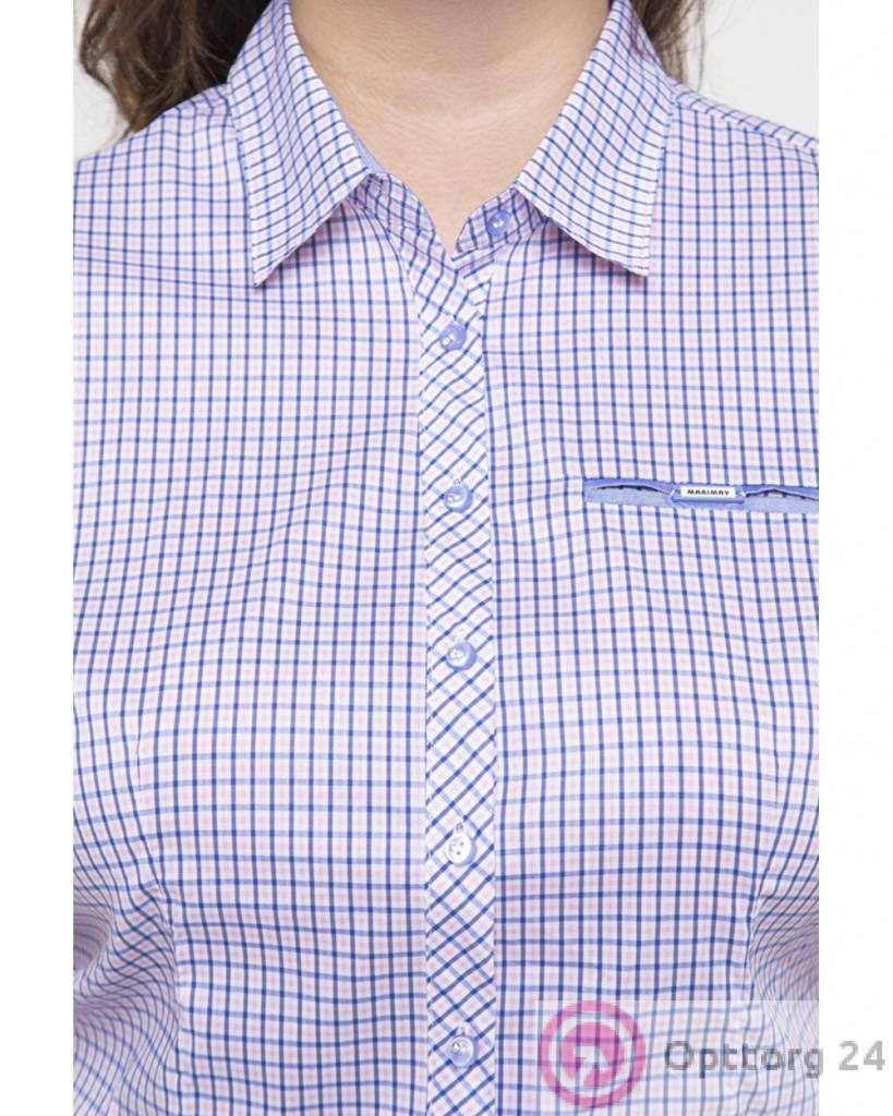 Женская клетчатая блузка розового цвета. Модель имеет отложной воротник и застегивается на пуговицы.