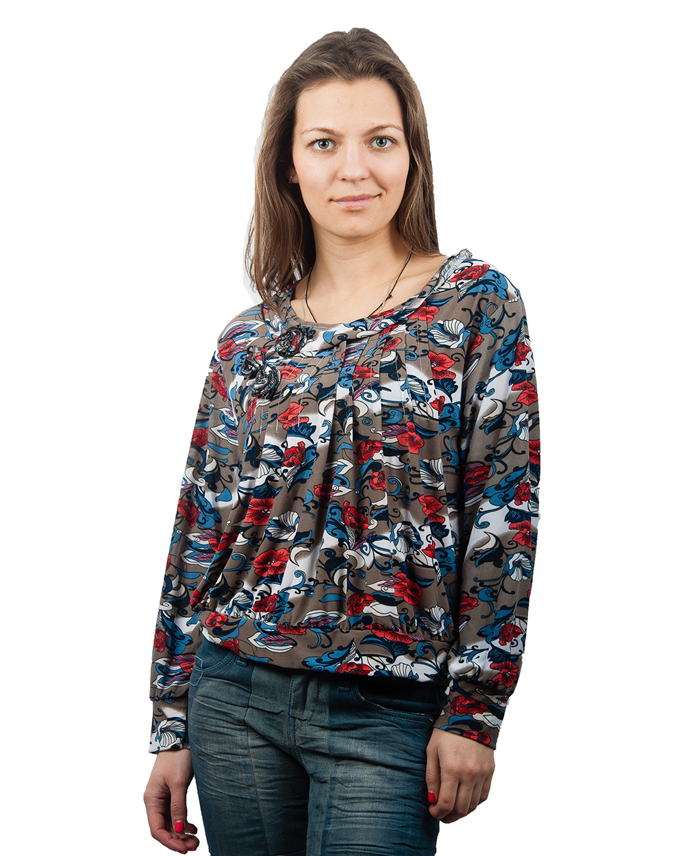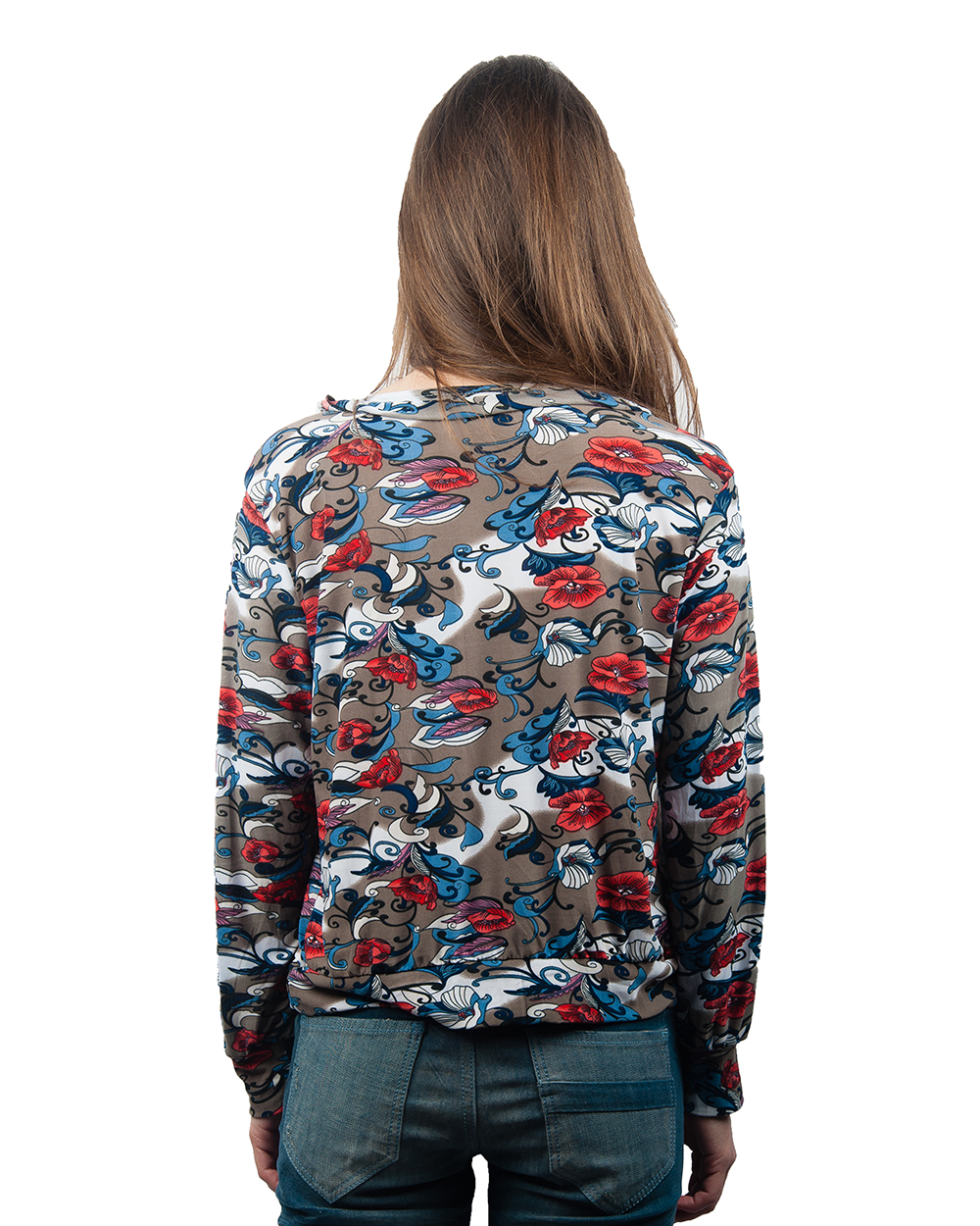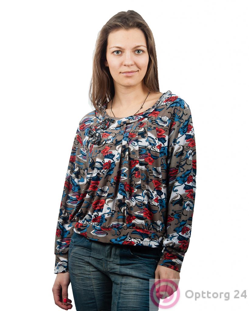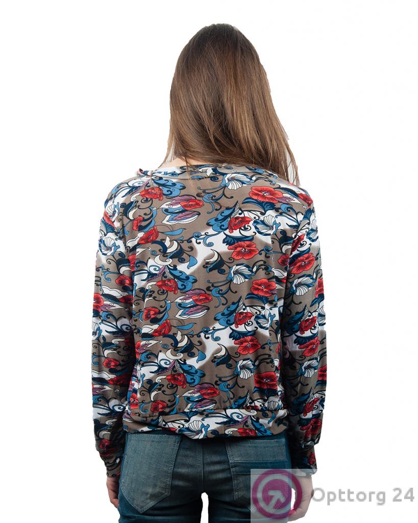 Блузка женская с декором на резинке кофейная с красно-синими цветами оптом