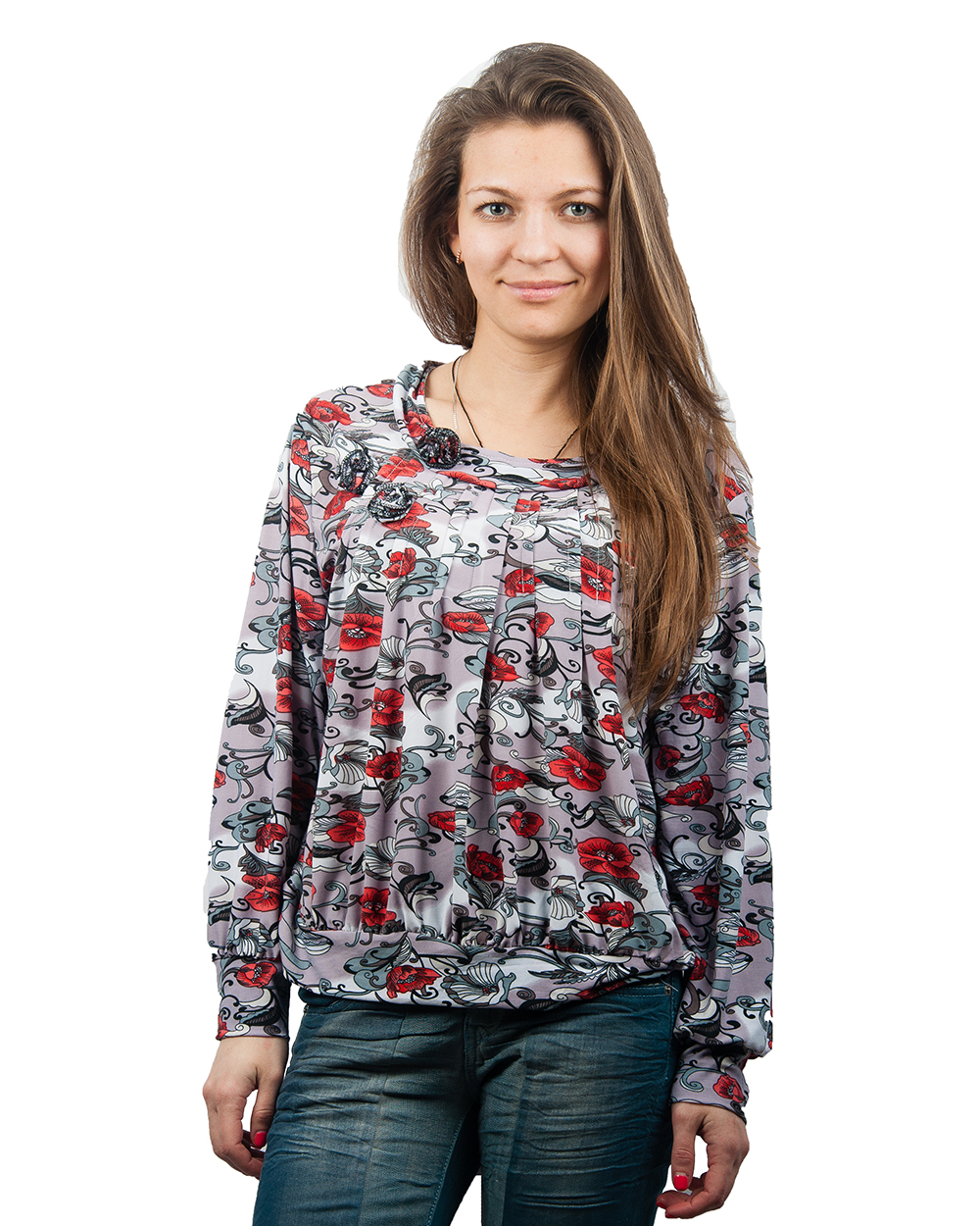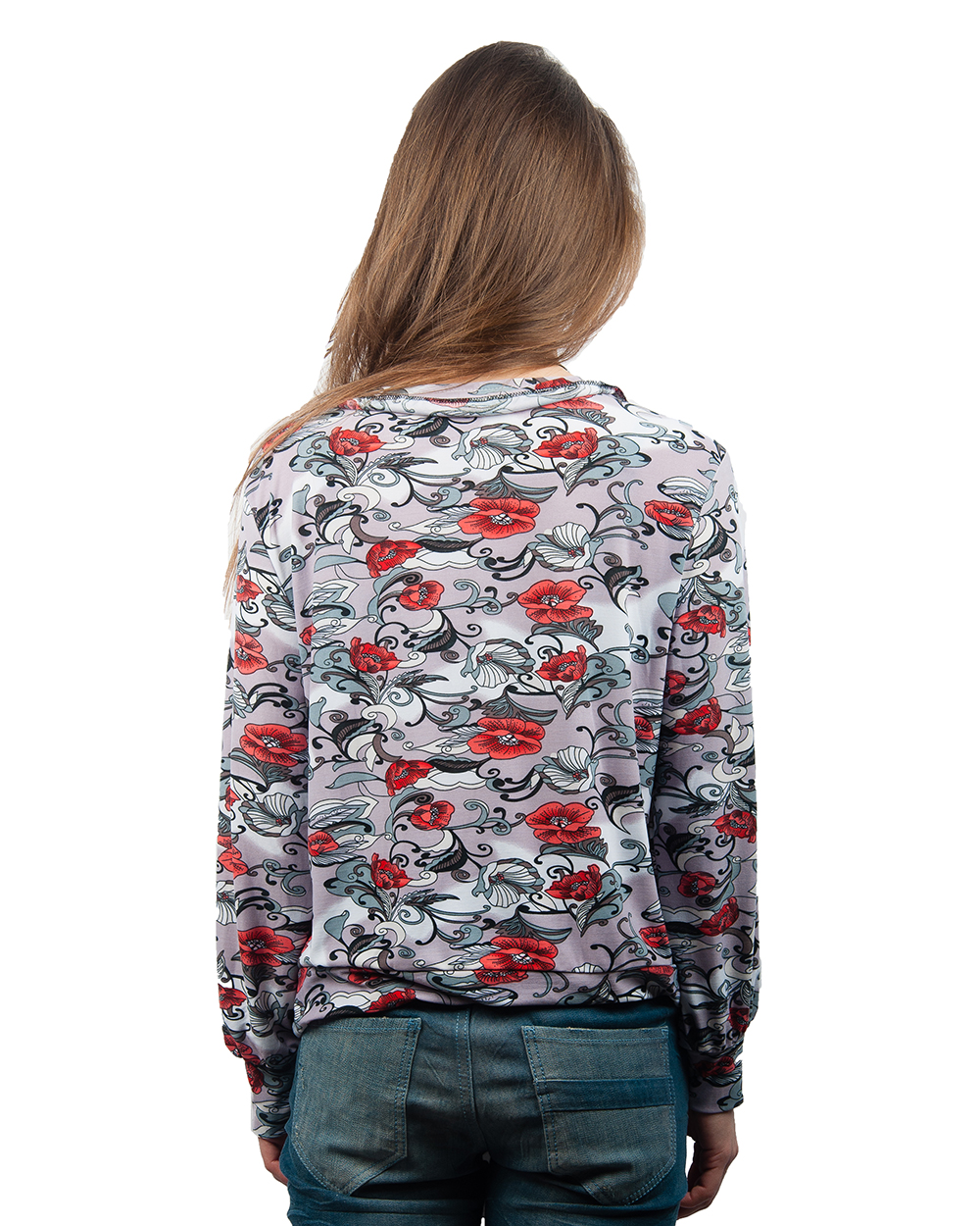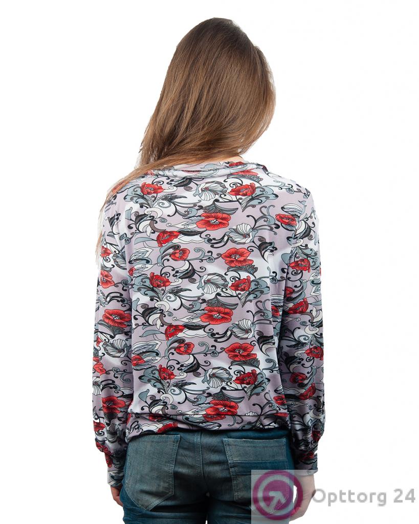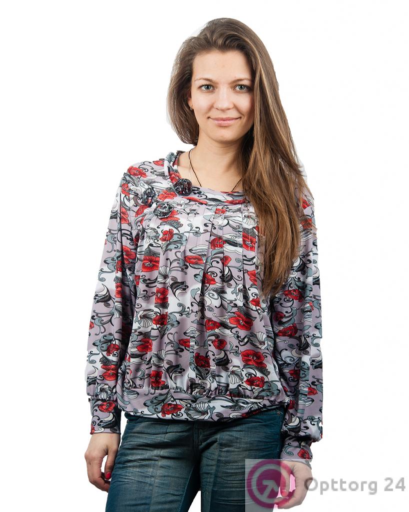 Блузка женская с декором на резинке серая с красными цветами оптом