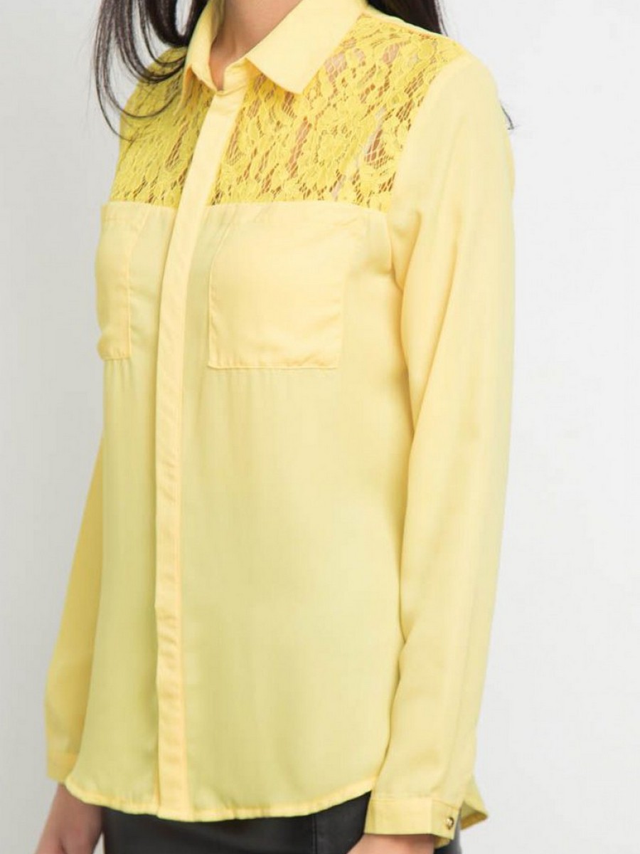 Модная блузка для женщин с кружевной вставкой имеет длинные рукава и застежку на пуговицах. Верх модели украшен накладными карманами.