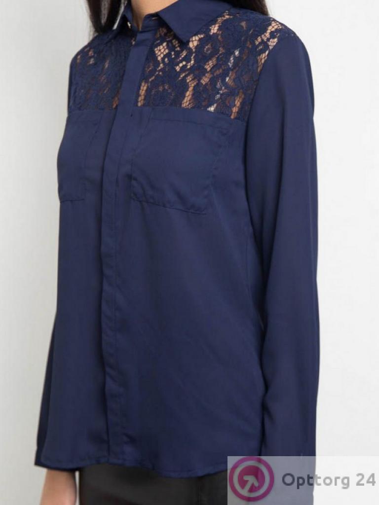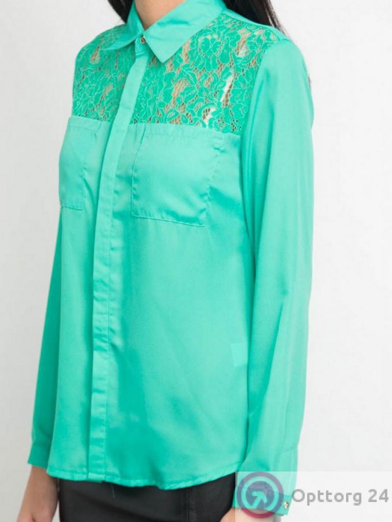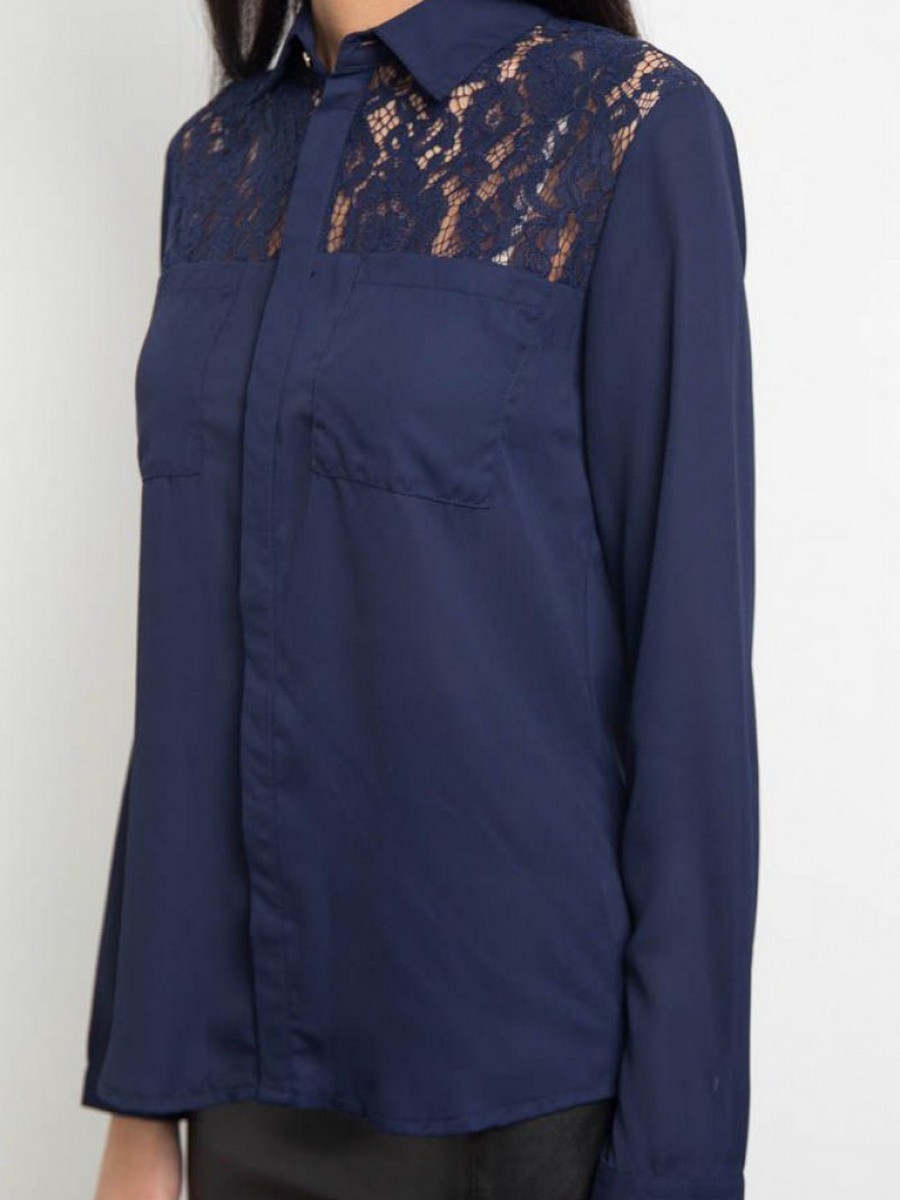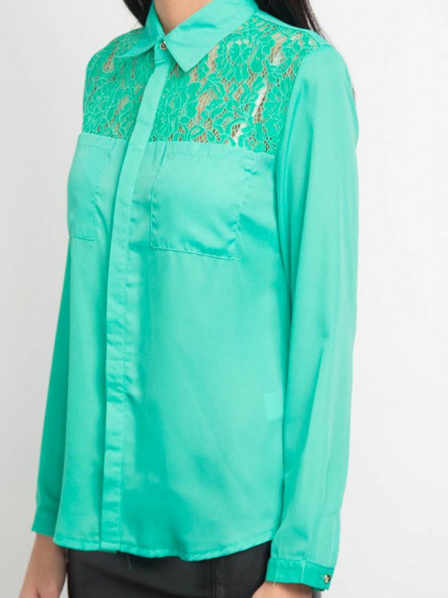 Классическая блузка для стильных женщин с длинными рукавами. Верх изделия выполнена из кружева. Застежка состоит из пуговиц. Верх модели украшен накладными карманами.