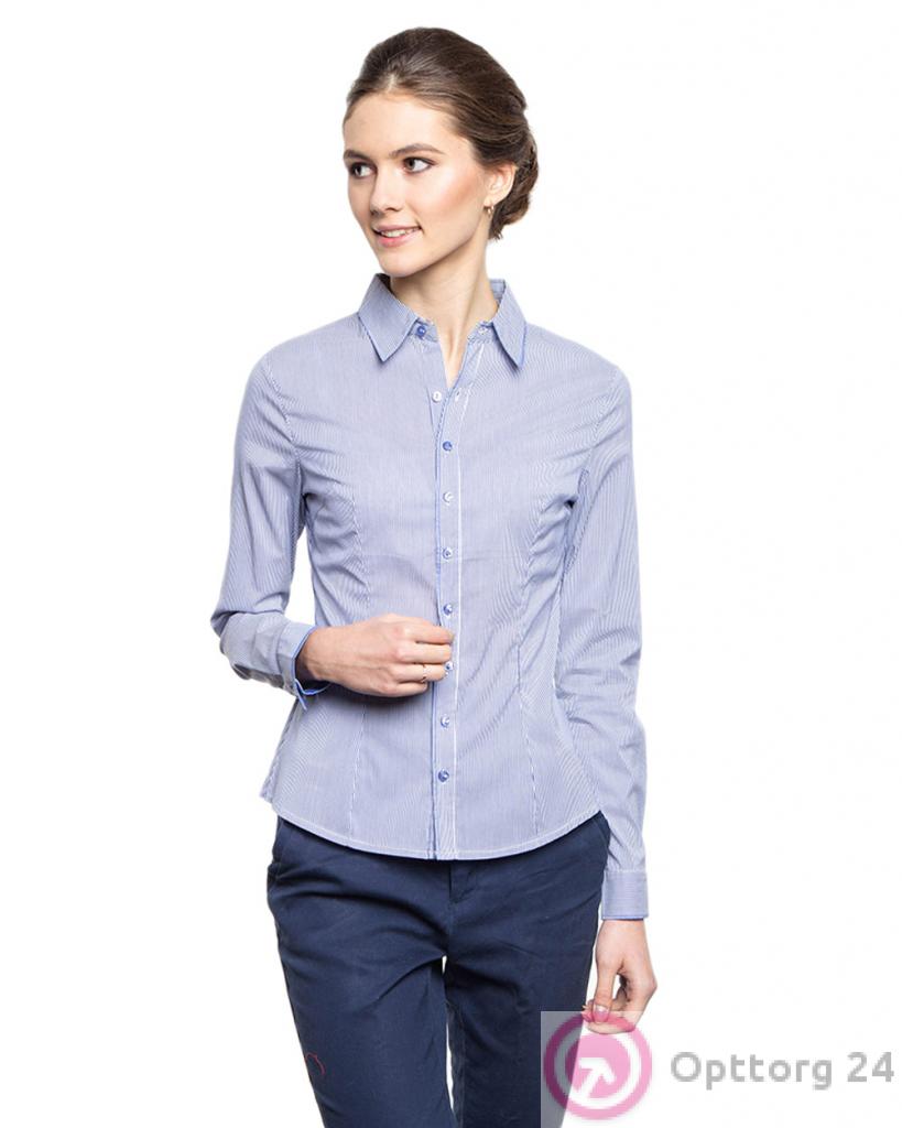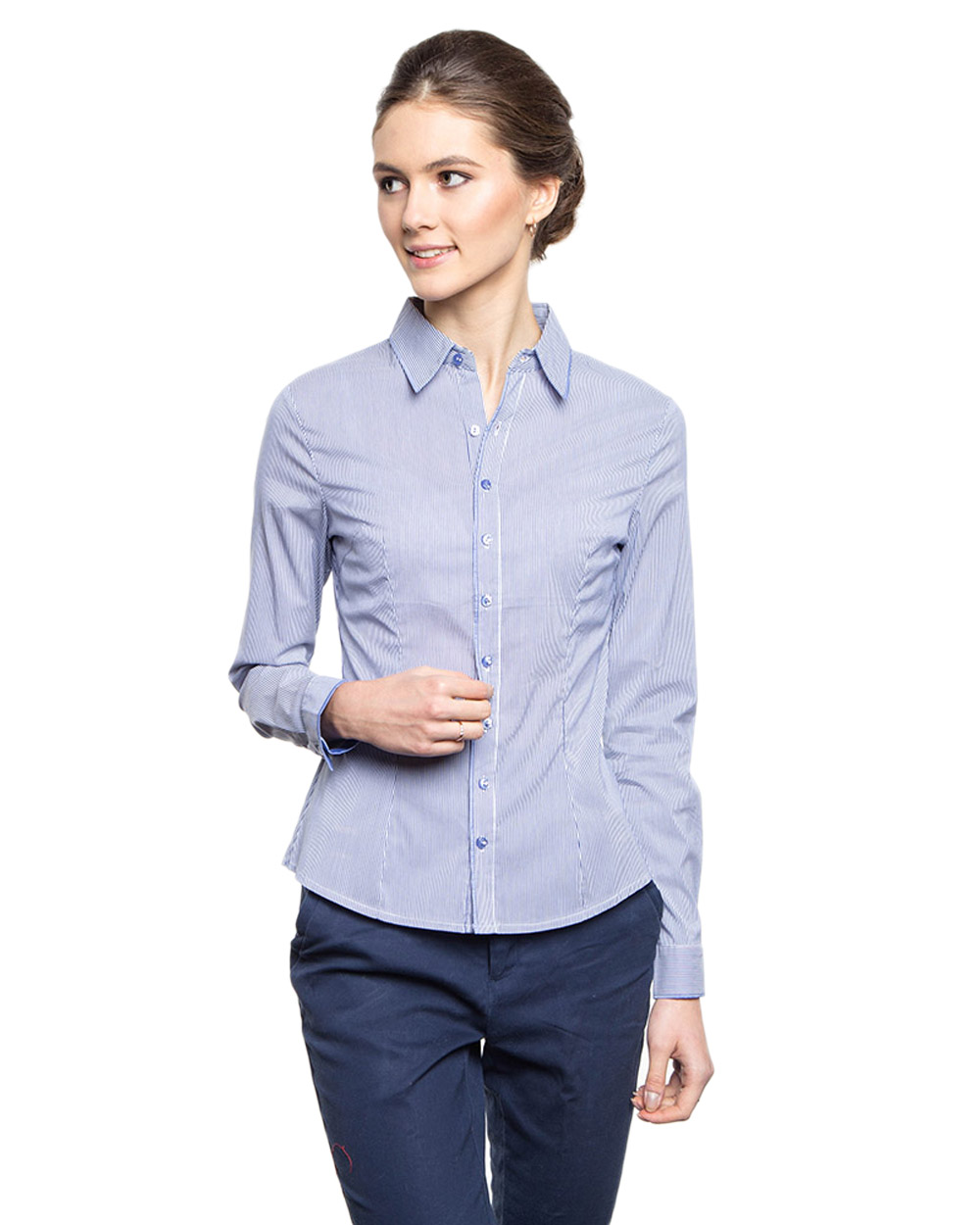 Стильная блузка для девушек с актуальным принтом в мелкую полоску. Модель с длинными рукавами, края и воротник отделаны красивой светлой отделкой. Перламутровые пуговицы подобраны в тон изделию. Прекрасный выбор для ценителей делового стиля.