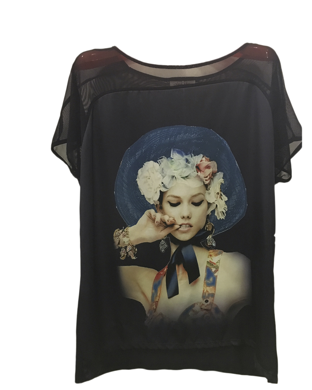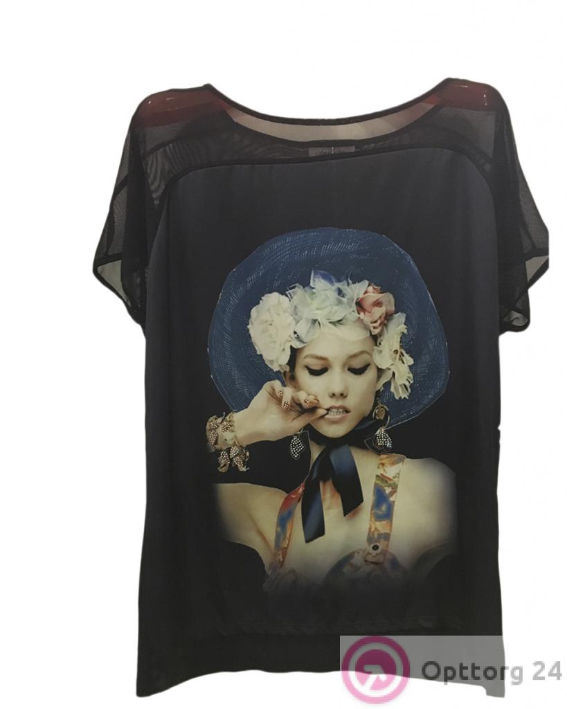 Оргинальная молодежная блузка с рисунком женщины. Рукава и плечики выполнены из сетчатого материала.