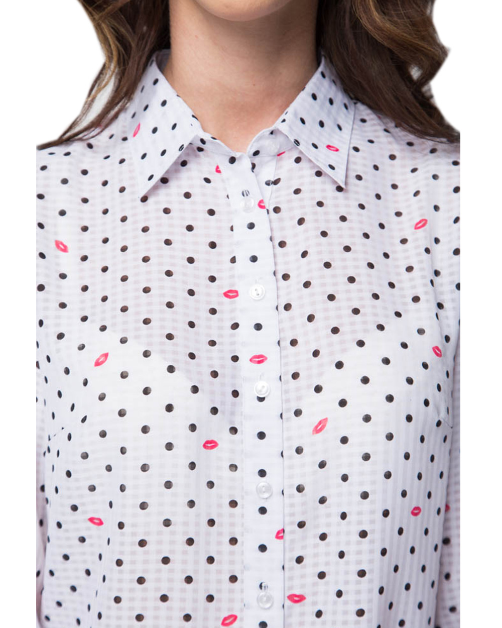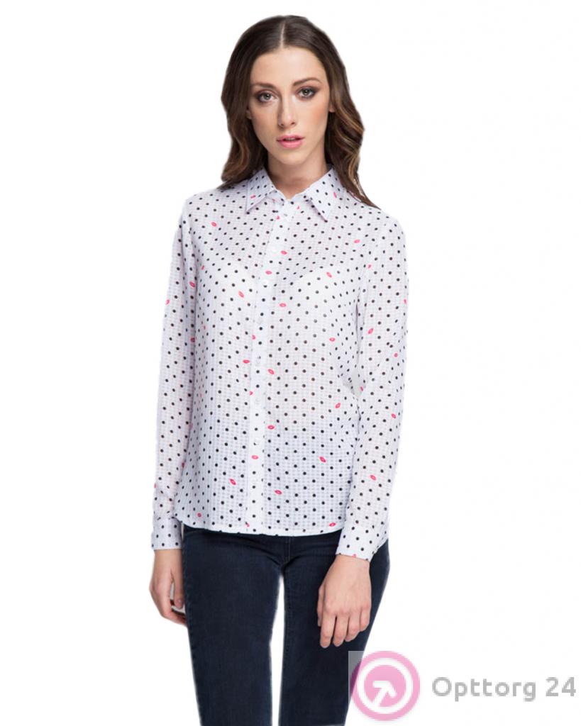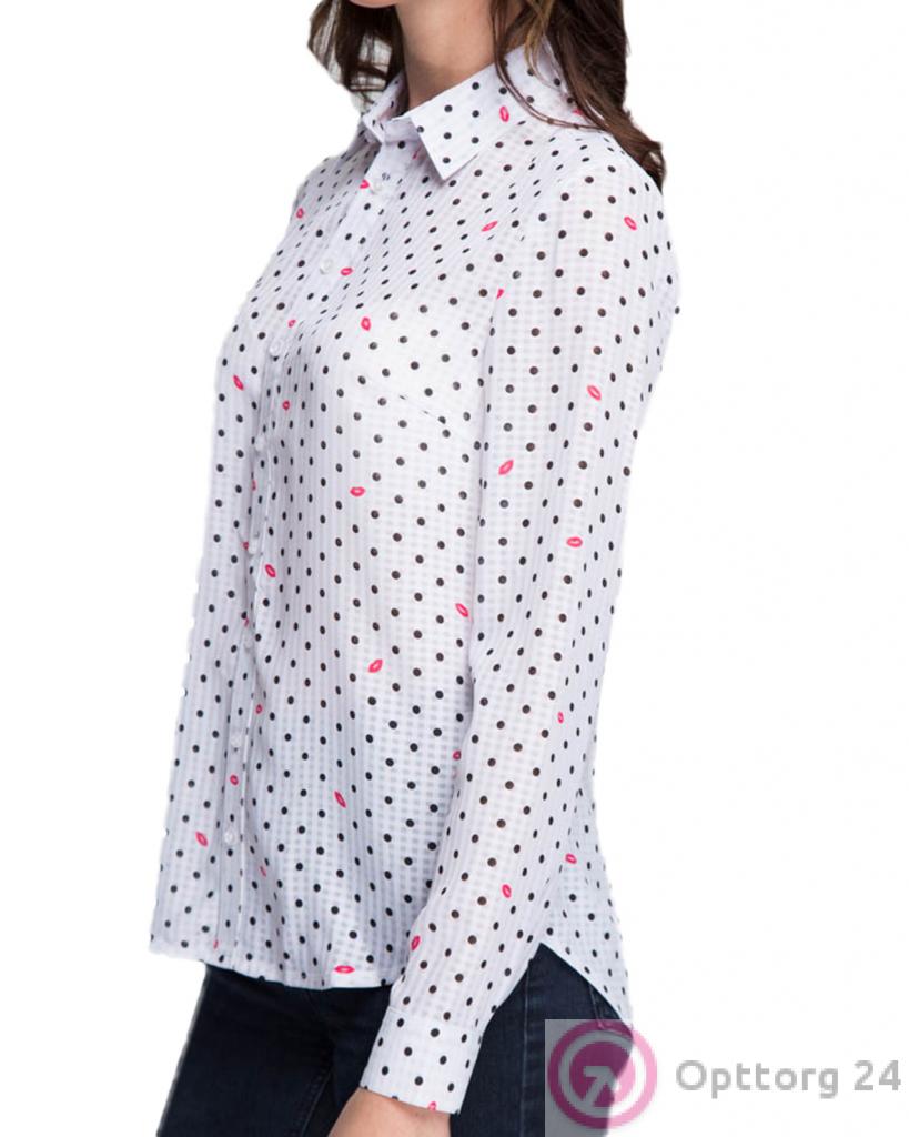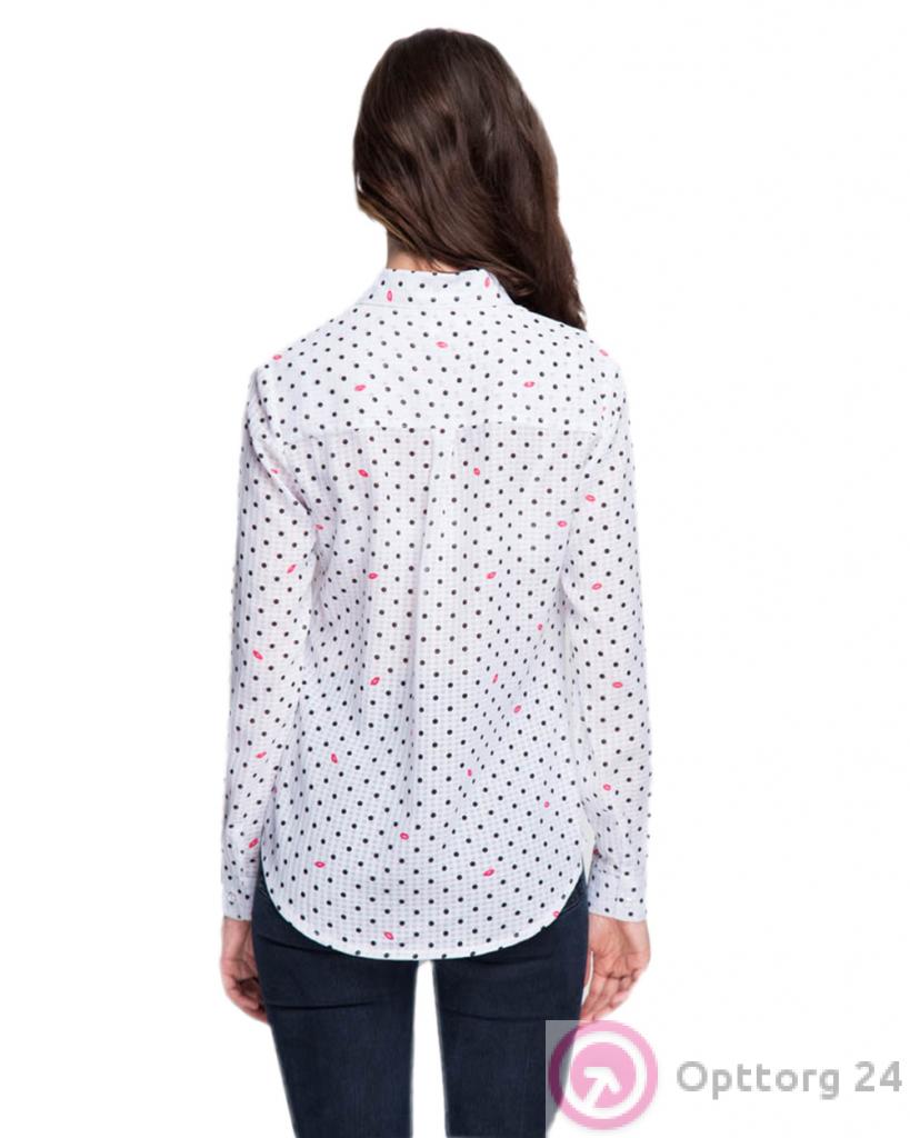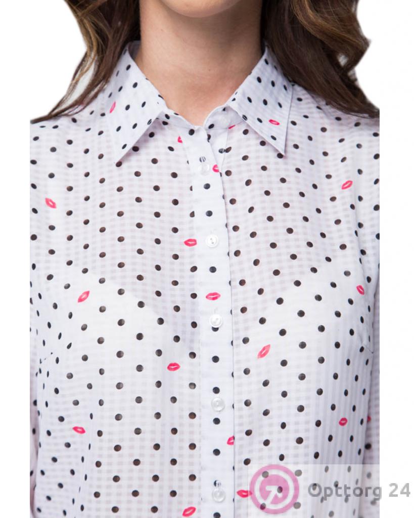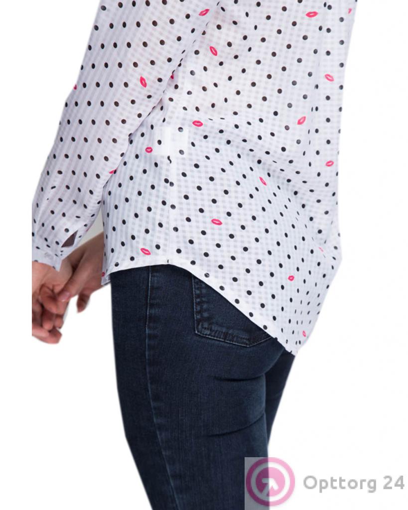 Симпатичная женская блузка белого цвета с принтом в черные горохи и красными губками. Длинные рукава, застежка на пуговицы.