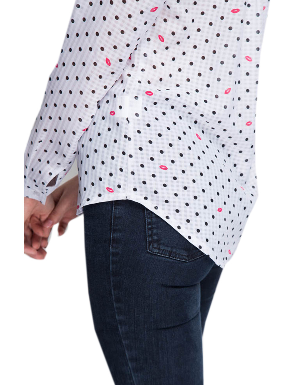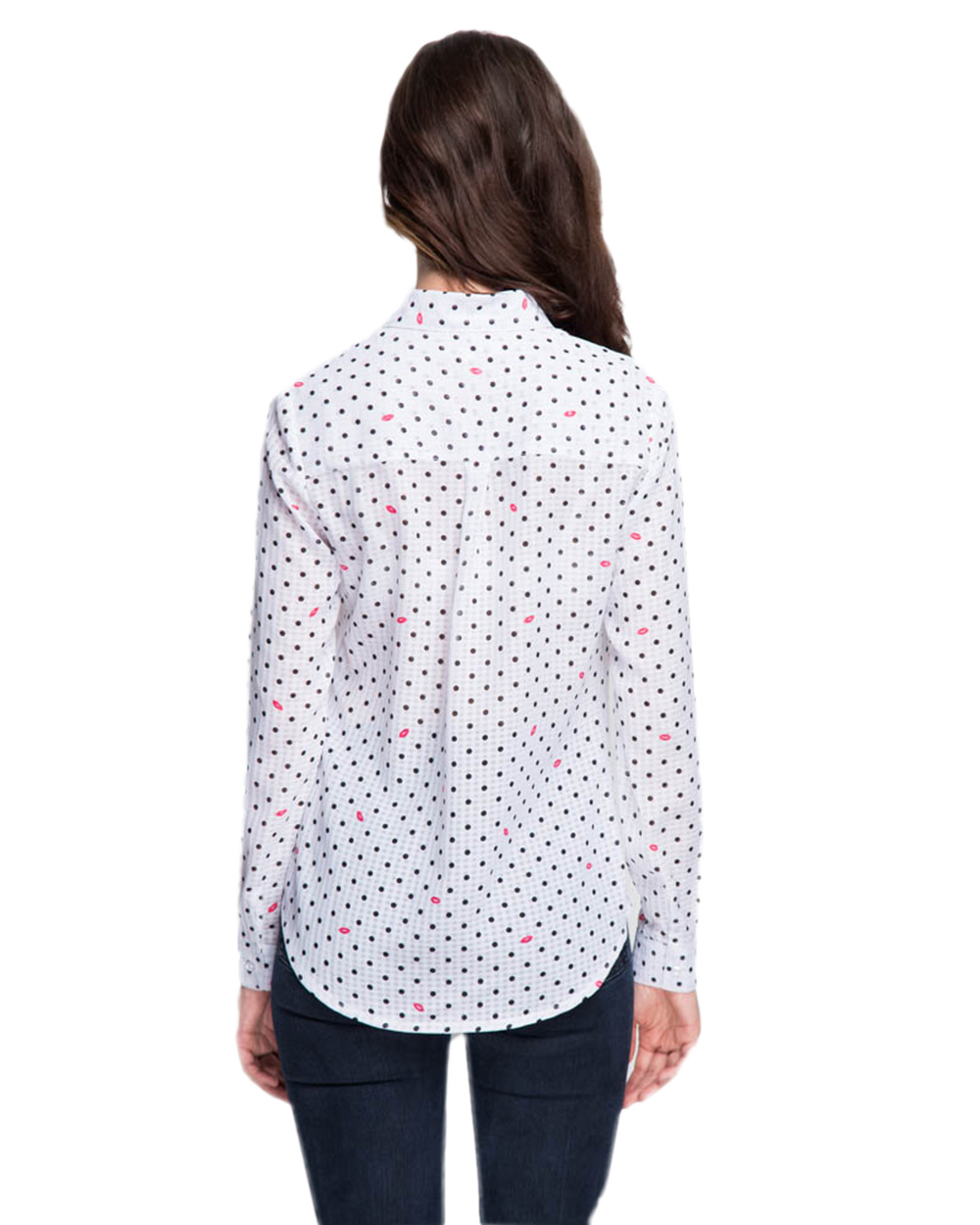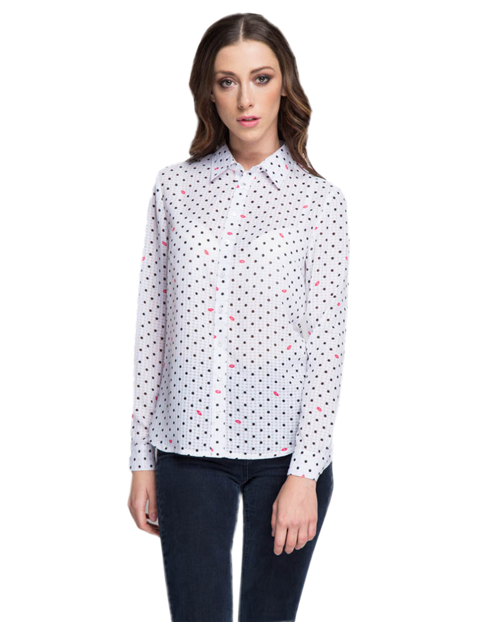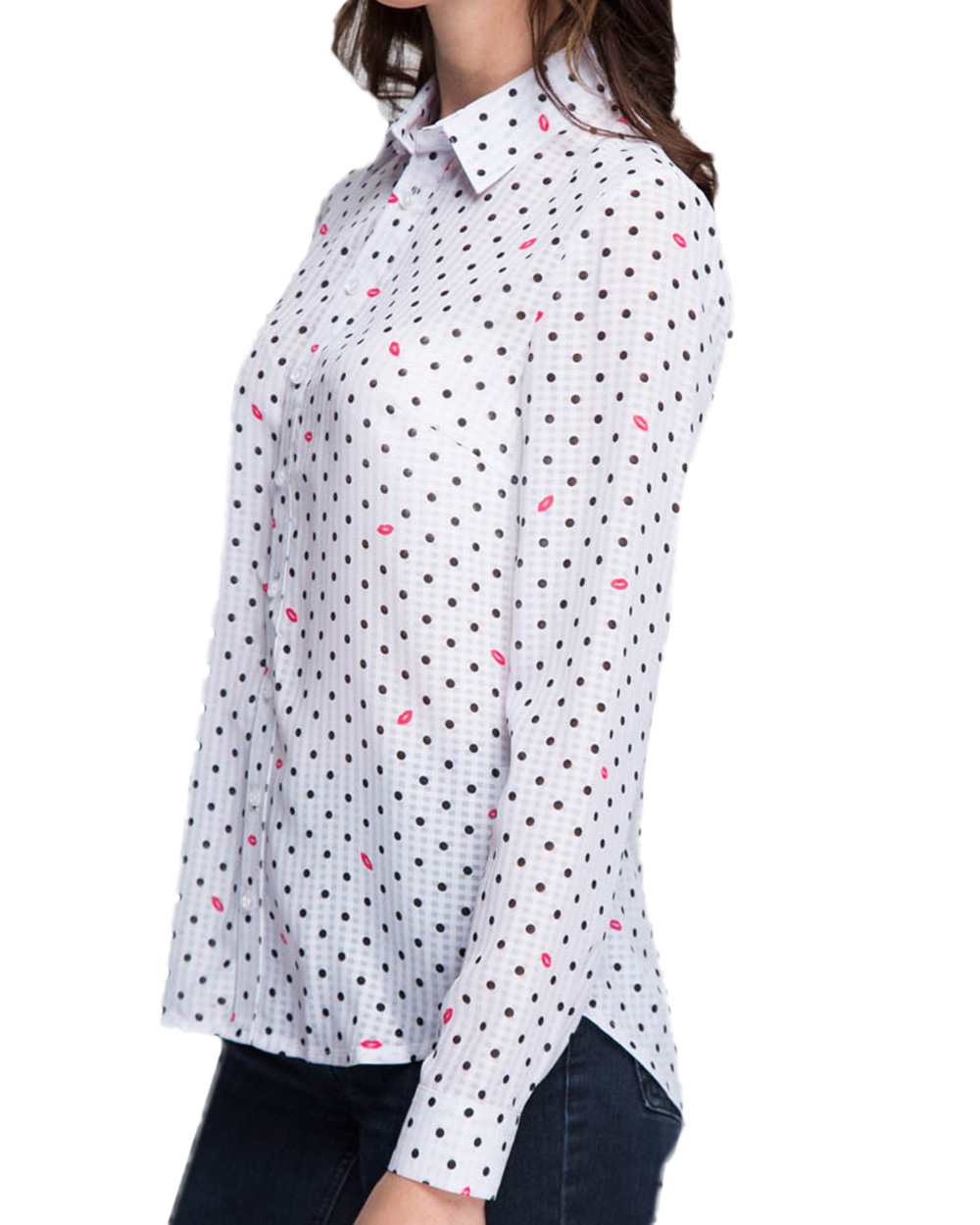 Симпатичная женская блузка белого цвета с принтом в черные горохи и красными губками. Длинные рукава, застежка на пуговицы.