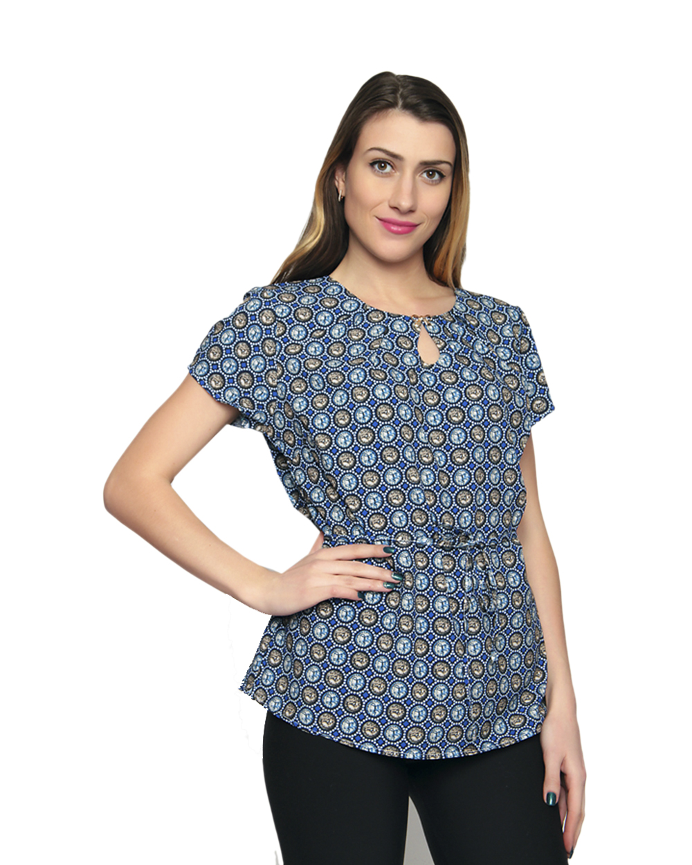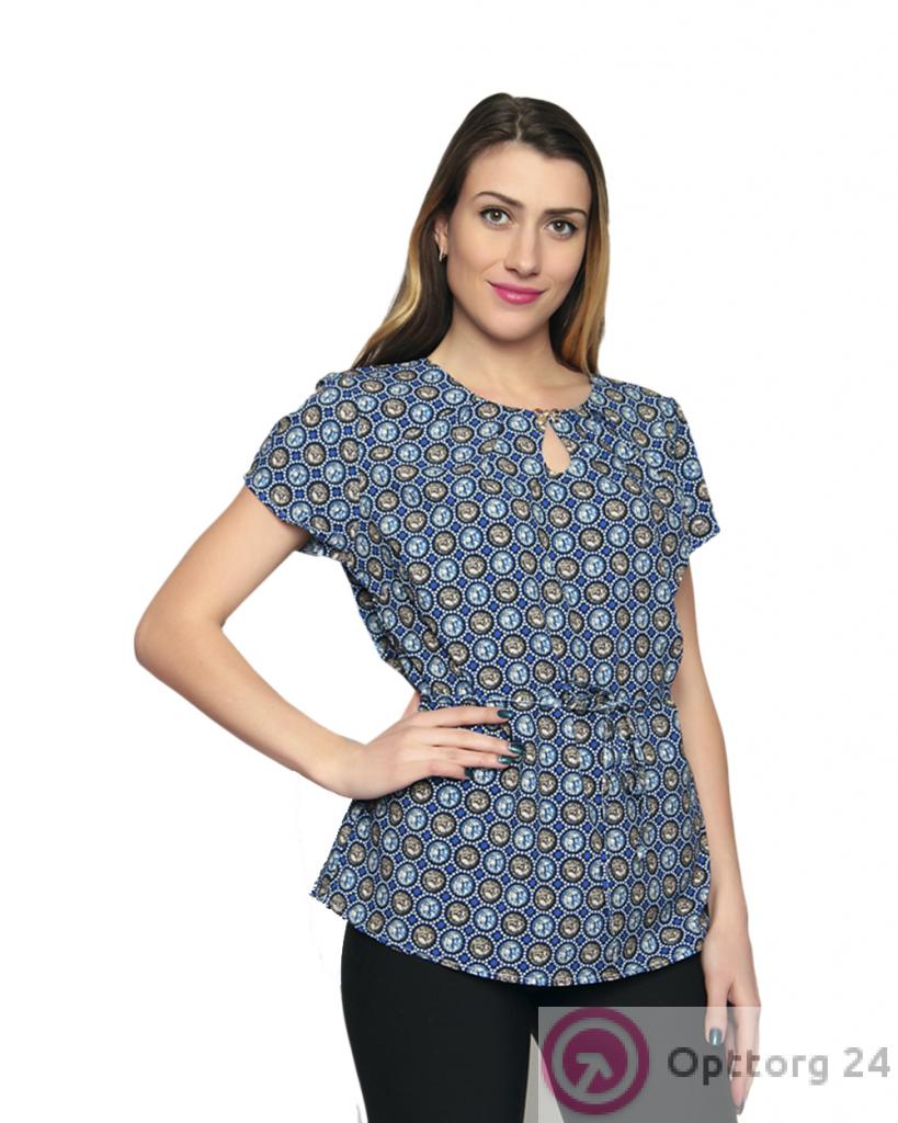 Стильная блузка с поясом на талии. Модель имеет короткие рукава.
