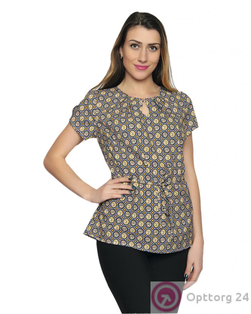 Легкая неброская модель с округлой горловиной и вырезом-капелькой спереди. Линию талии подчеркивает тонкий пояс.