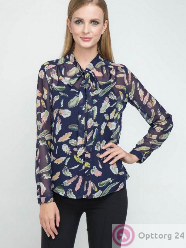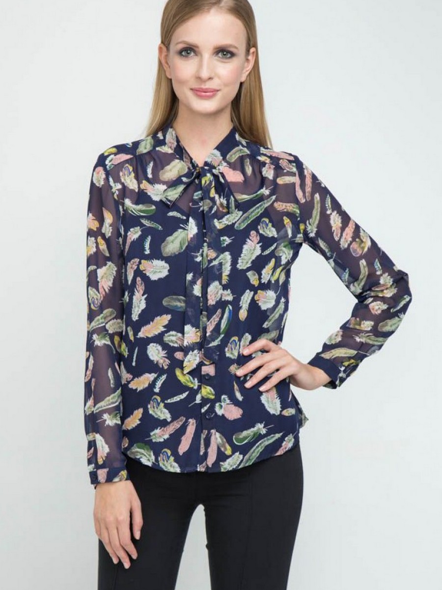 Блузка шифоновая для женщин синяя с рисунком в виде перьев. Изделие имеет длинные рукава и неглубокий вырез на завязках. Свободный крой модели.