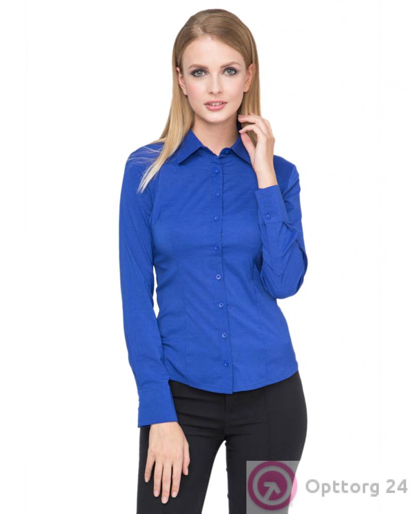 Стильная классическая блузка синего цвета с синими пуговицами. Модель имеет приталенный крой и длинные рукава.
