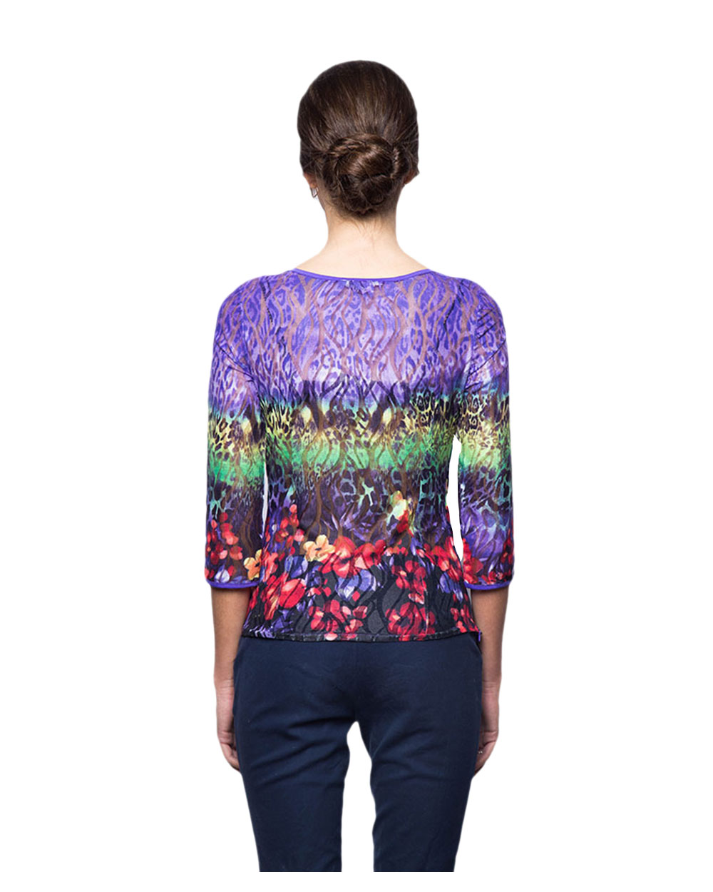 Легкая приталенног кроя блузка с ярким принтом. Модель имеет полупрозрачную спинку и подкладку спереди. Для удобности одевания есть молния сбоку.