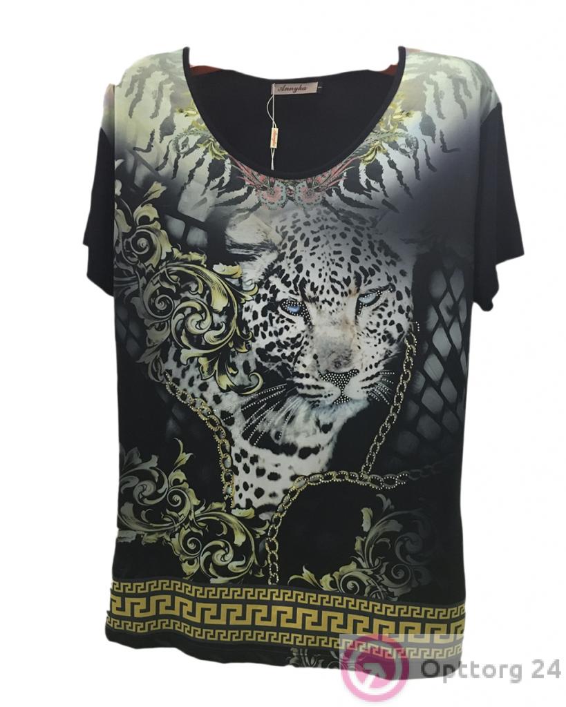Симпатичная женская блузка прямого кроя. Изделие имеет округлую горловину и короткие рукава.