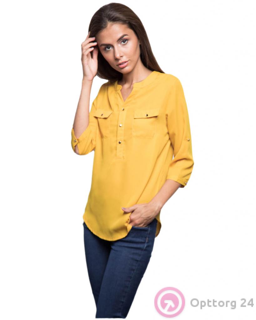 Молодежная блузка желтого цвета с накладными карманами на груди. Модель имеет прямой крой.