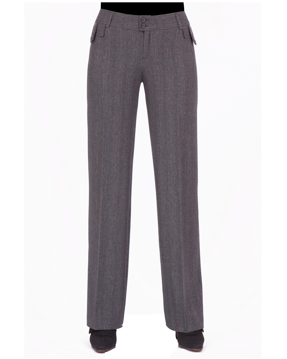 Классические брюки, с расклешенными к низу штанинами. Модель имеет пуговицы и молнию, а также предусмотрены петли для ремня.