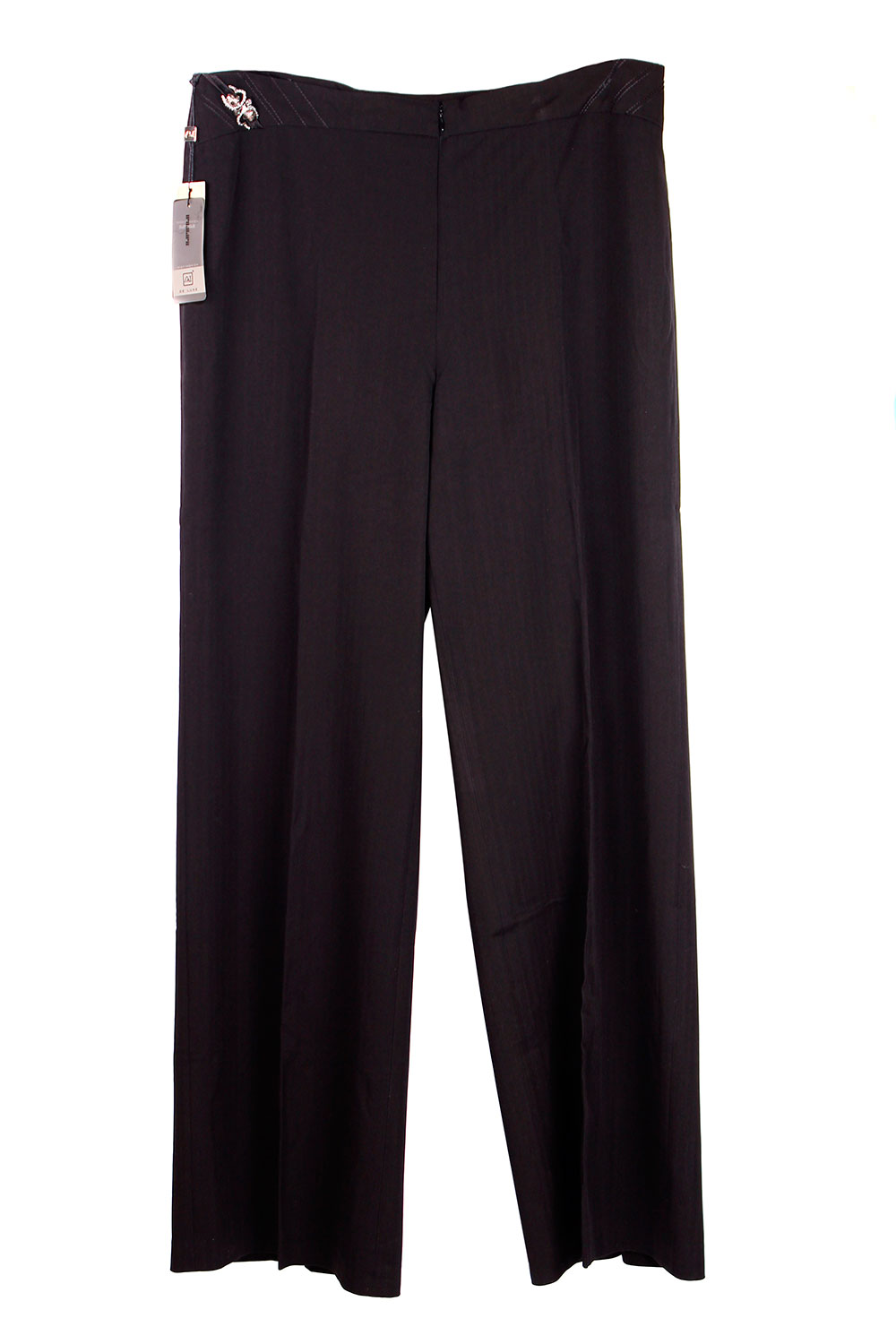 Классические женские брюки из плотной ткани черного цвета с декоративной пряжкой на боку. Модель с глубокой посадкой, чуть завышенной талией, расклешенная от бедра, с поясом, со шлёвками для ремня.