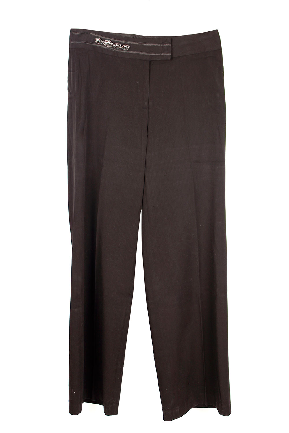 Классические женские брюки темно-коричневого цвета. Модель расклешенная от бедра, завышенная талия. За счет лайкры в составе ткани, брюки хорошо садятся на фигуру. Ткань мягкая, струящаяся, красиво обрисовывает силуэт.