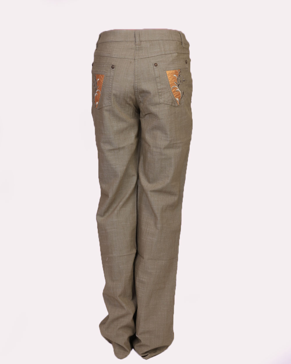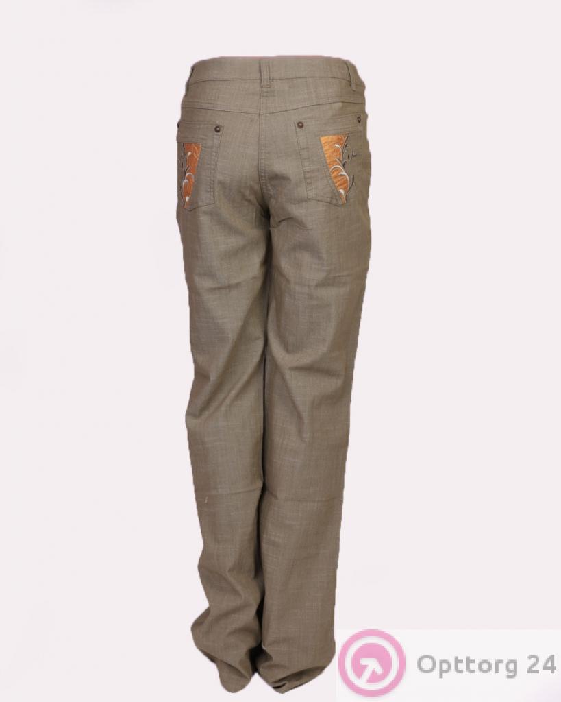 Брюки женские льняные темно-серые с золотой вышивкой на карманах.