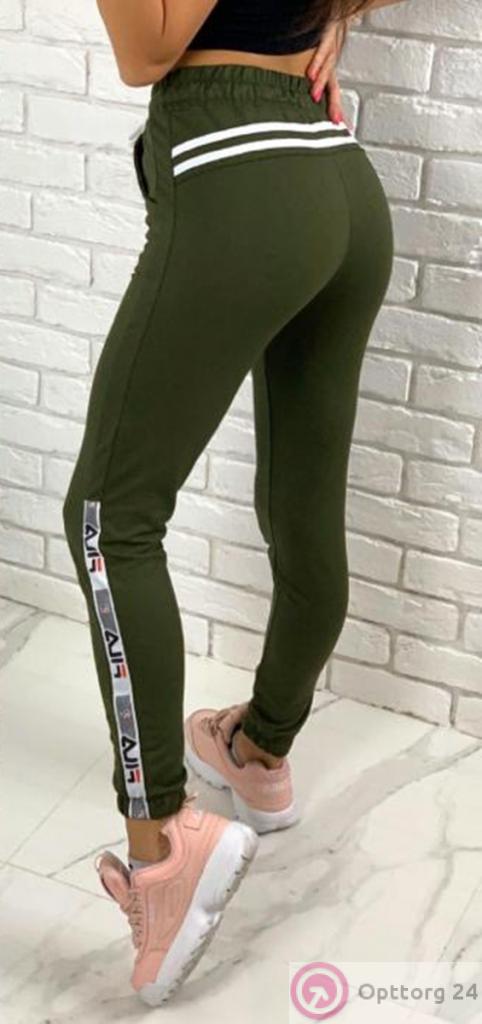 Описание: Брюки женские спортивные, цвет хаки. Пояс на резинке с белым шнурком. Низ брючин на резинке. От колена в низ надпись. Сзади две белых полосы.