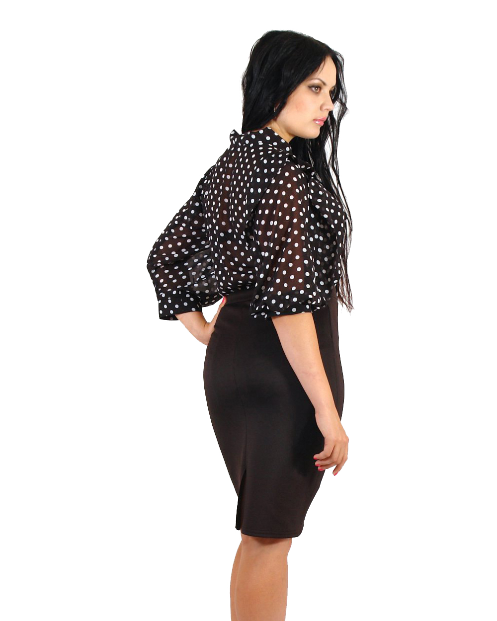 Солидное чёрное платье с достаточно сдержанным дизайном. Шифоновый верх и рукав в три четверти отлично сочетаются со строгой прямой юбкой до колена.
