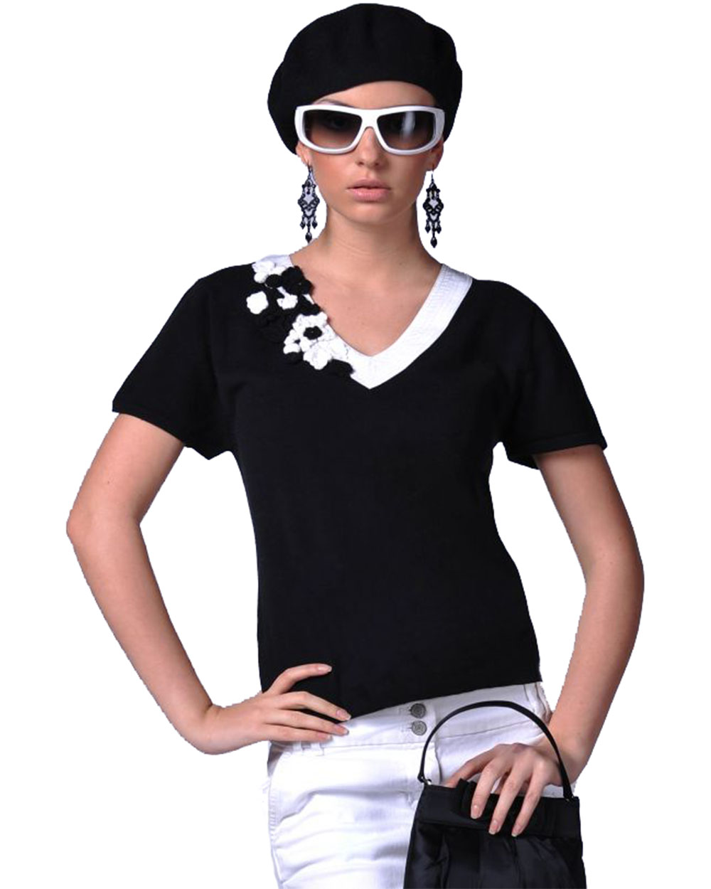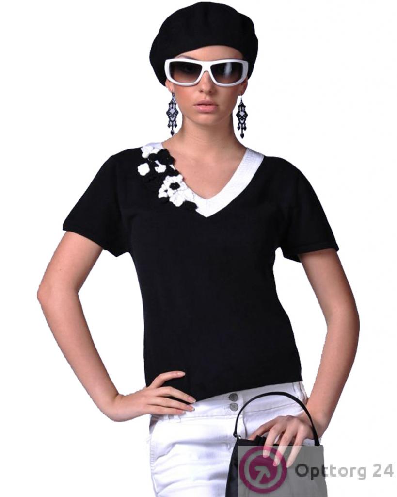 Джемпер женский черного цвета с белым кантом и цветами оптом