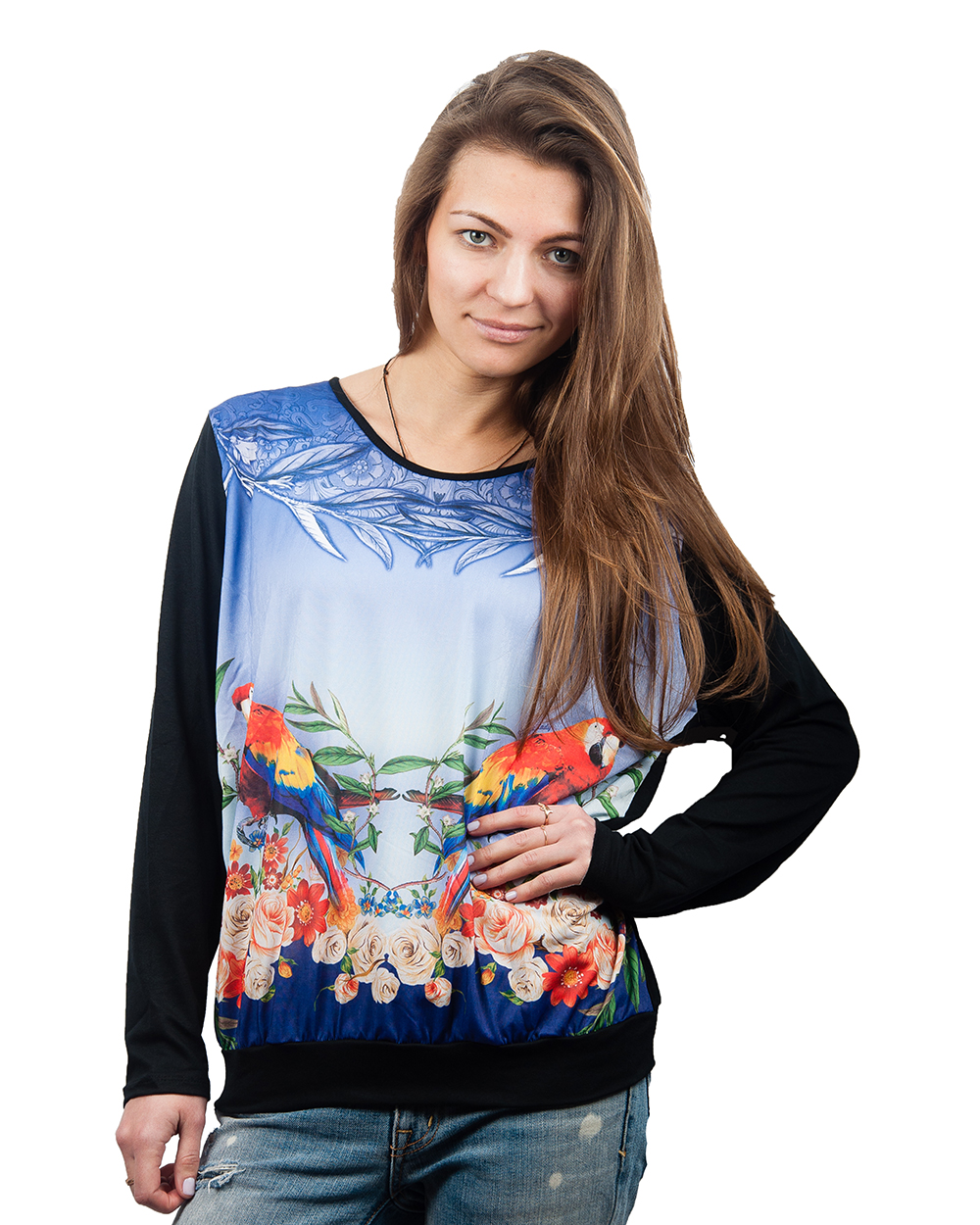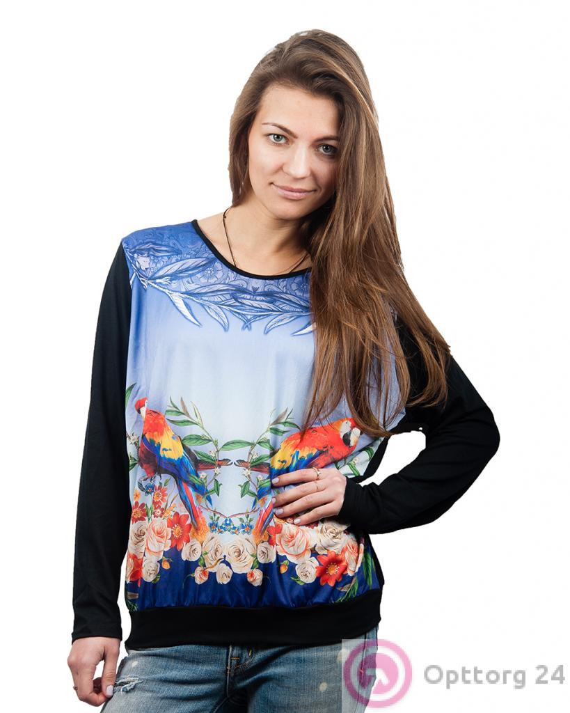 Джемпер женский черный с сиреневым принтом и попугаями оптом