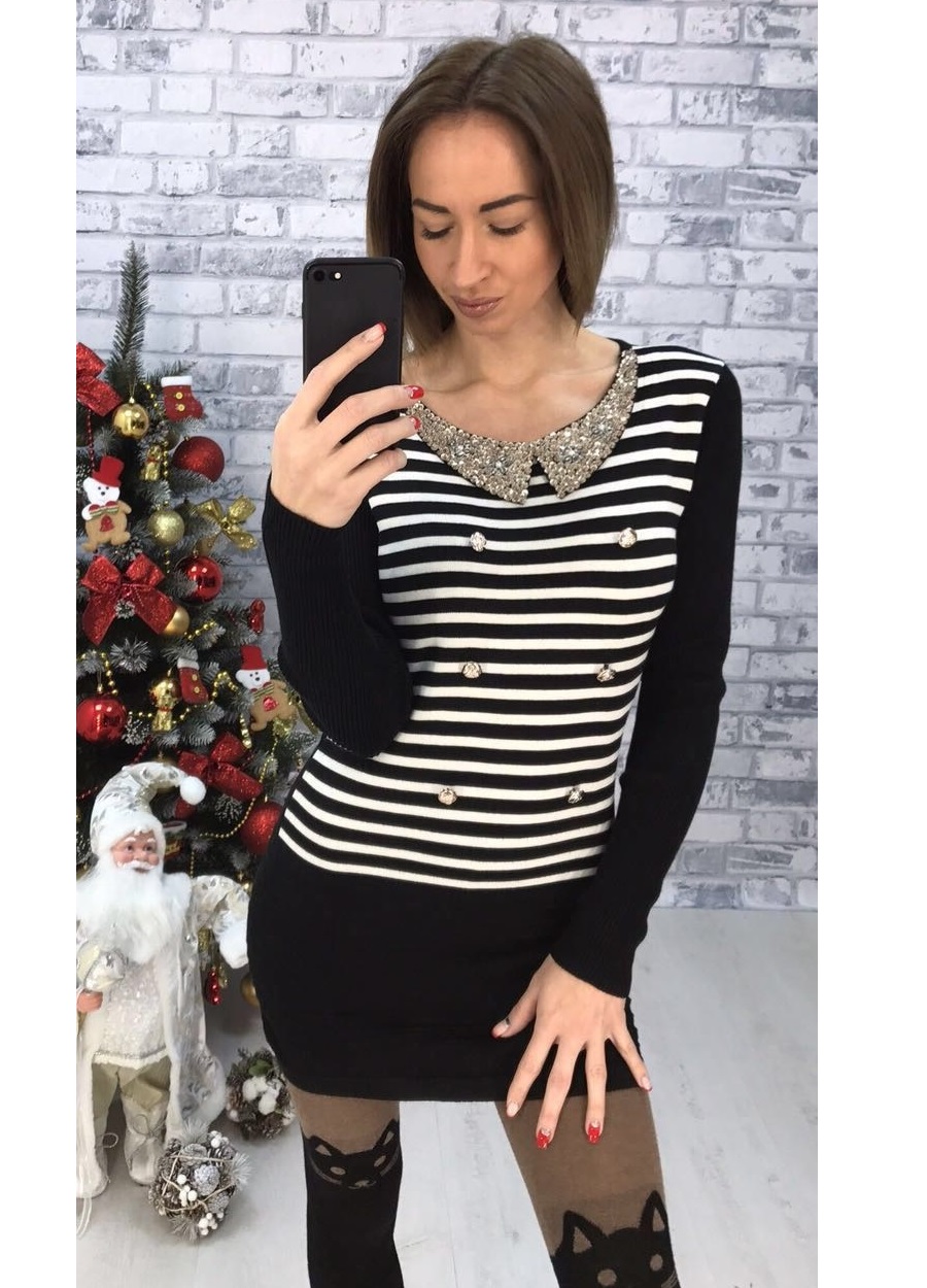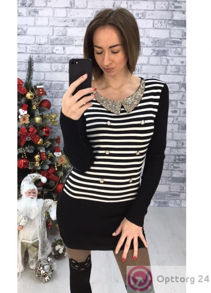Удобный женский джемпер черного цвета в белую полоску. Изделие удлиненного кроя, имеет украшение из страз на горловине и передней части изделия