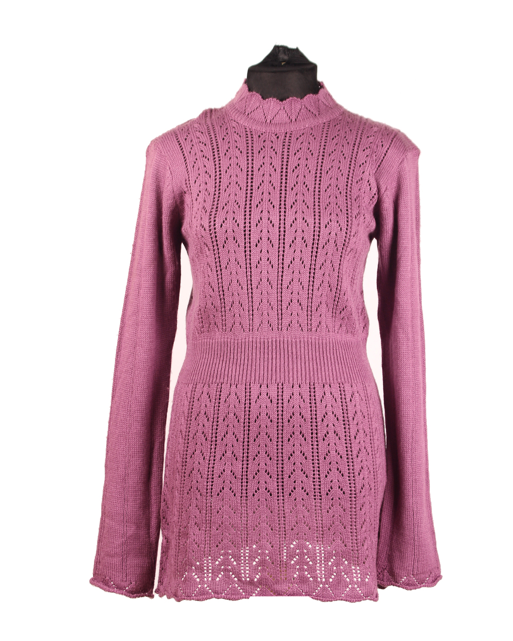 Великолепный длинный джемпер красивой вязки на длинный рукав с воротником стоечкой. Рукава имеют кружевные манжеты, чуть розширены. Линия талии выделена широкой полоской, связанной плотным узором. Прекрасное дополнение весеннего гардероба.