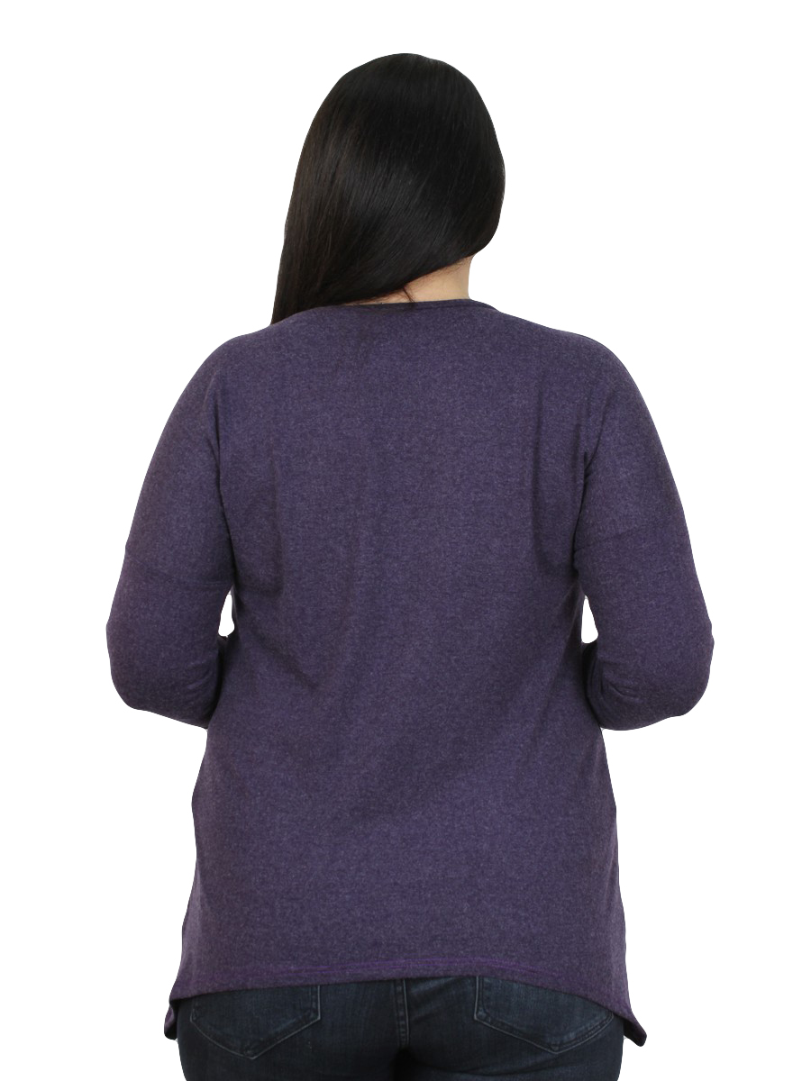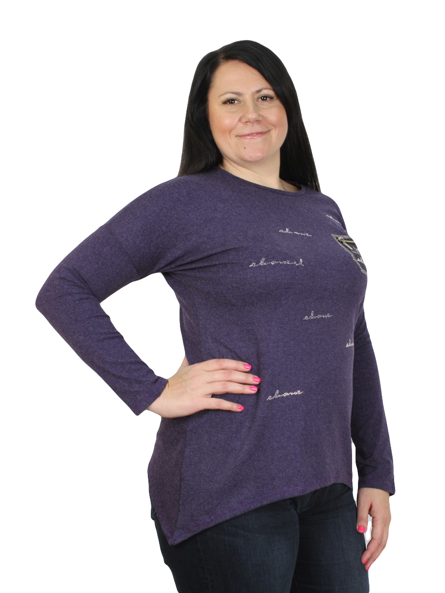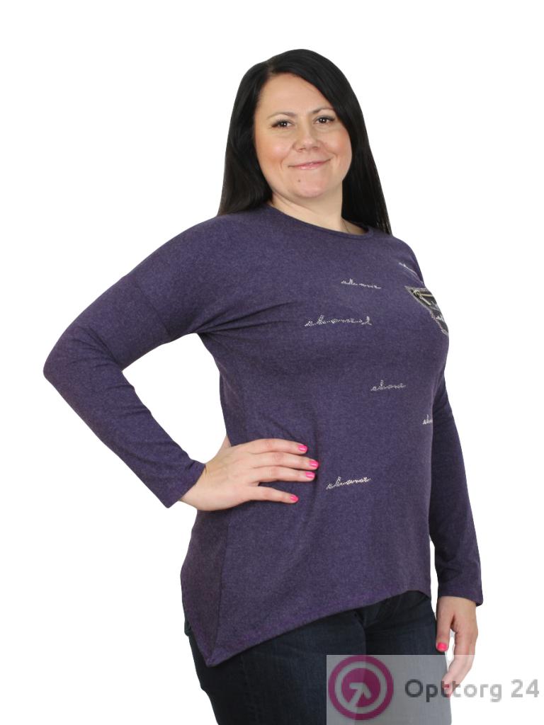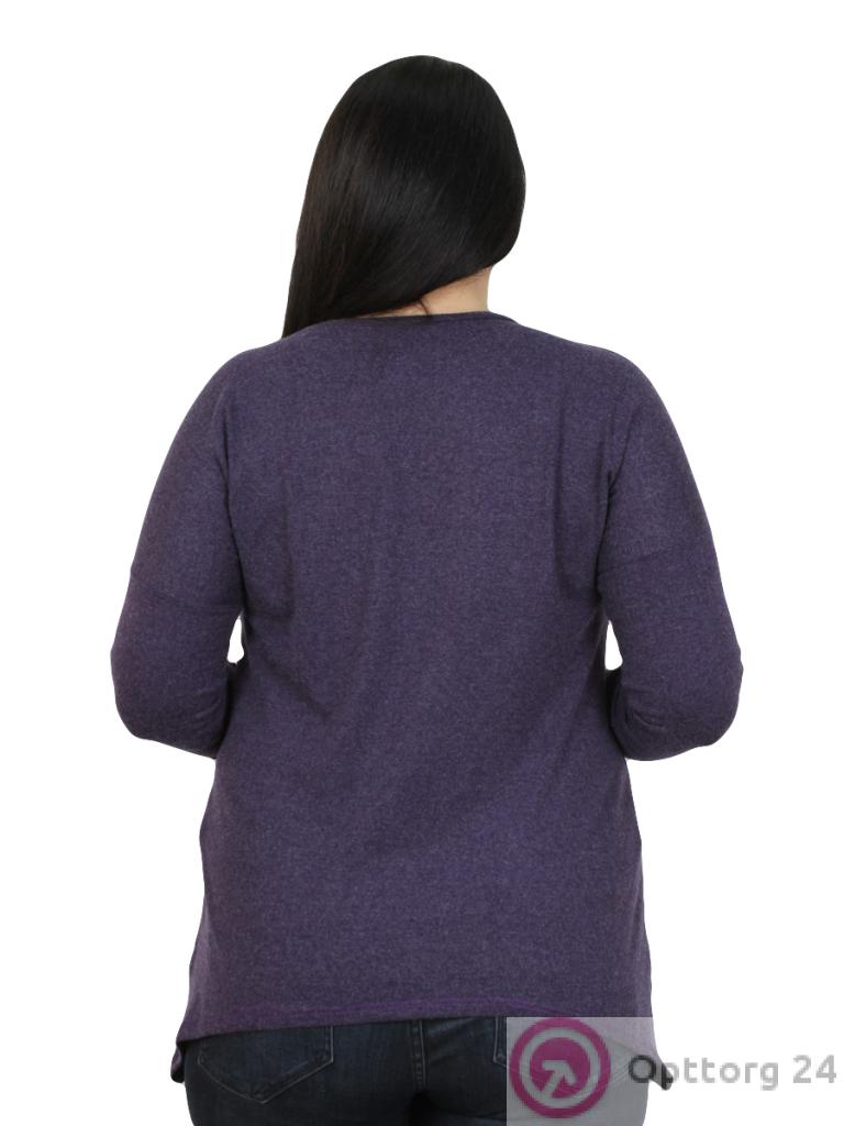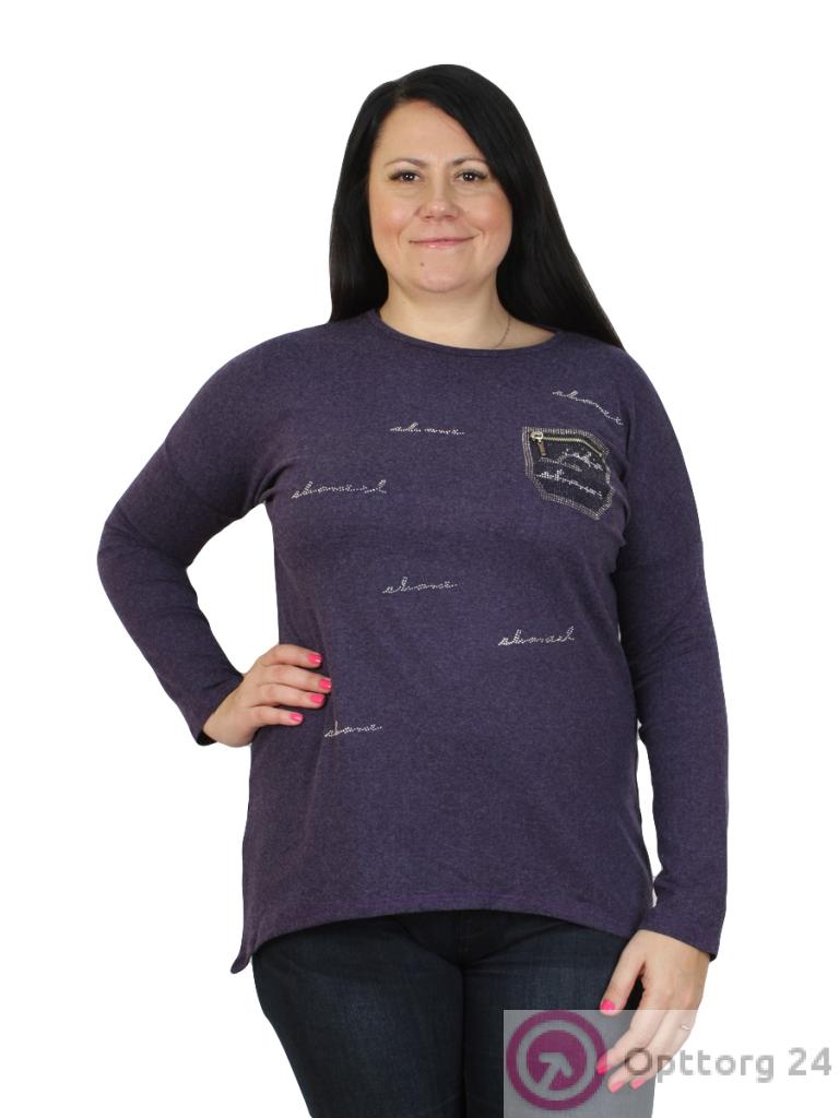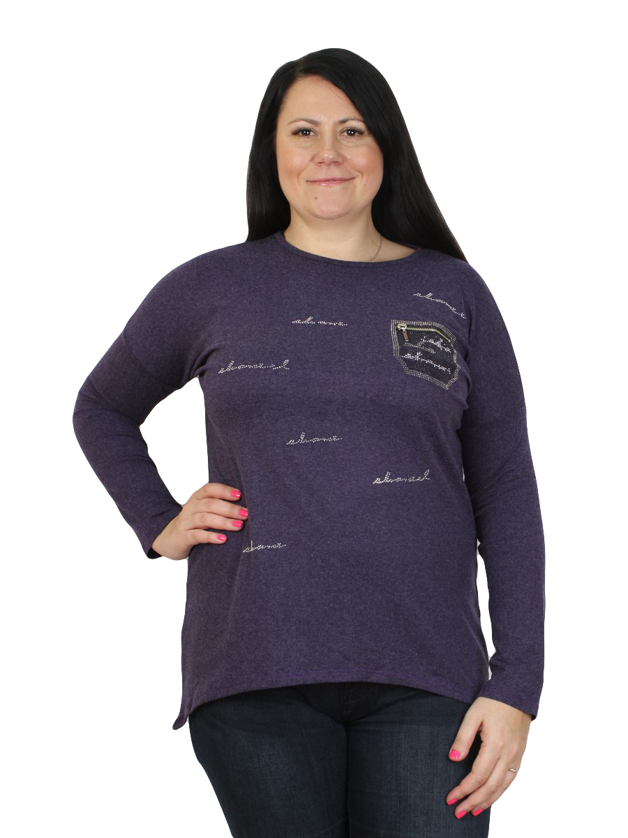 Джемпер для женщин фиолетового цвета имеет длинные рукава. Модель спереди имеет имитацию кармана из страз и надписи. Изделие с ассиметричным низом.