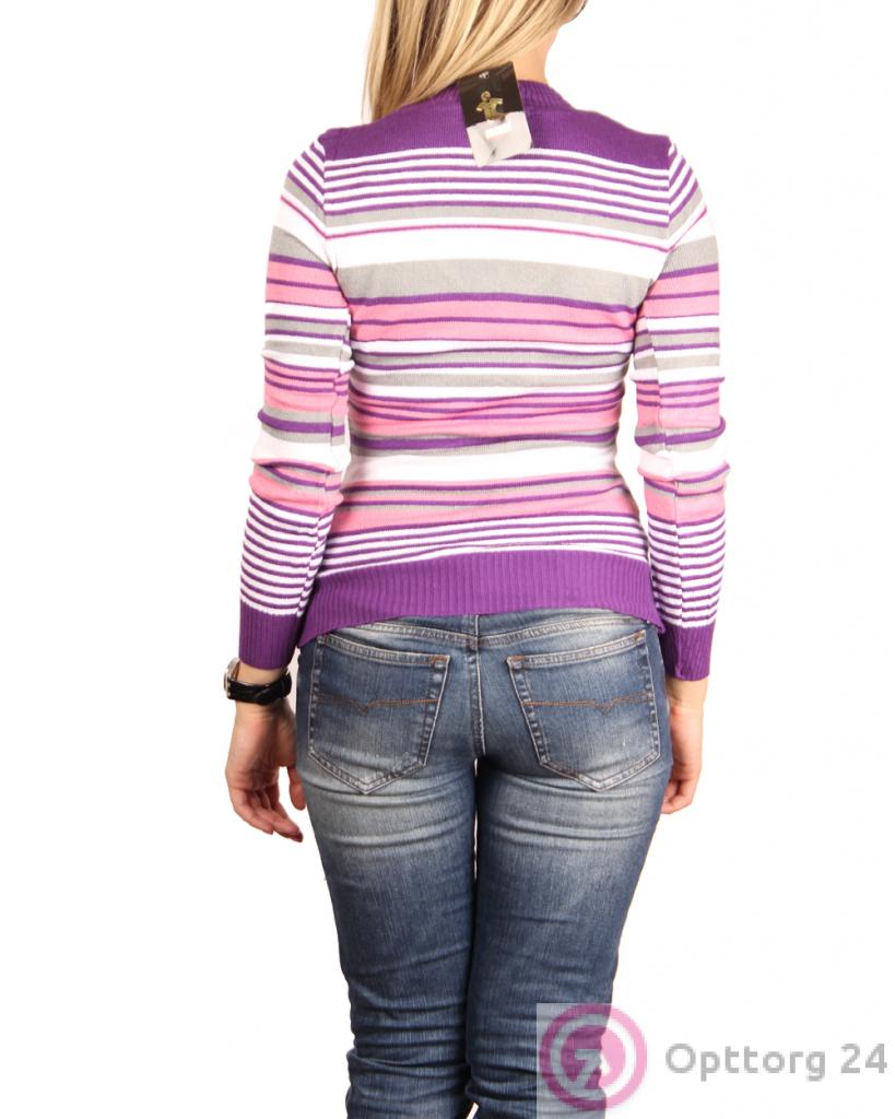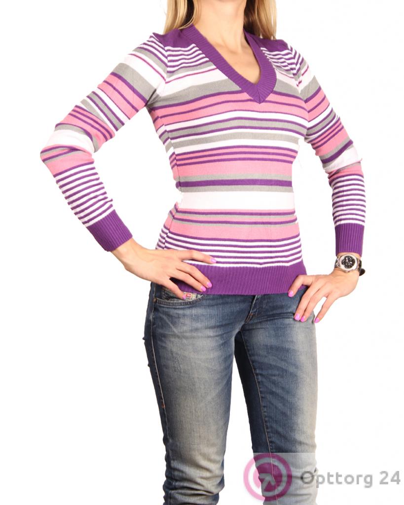 Яркий комбинированный женский джемпер фиолетового цвета с горизонтальными полосками розового, белого и серого цветов. Горловина у модели сделана V-образная, очень привлекательно смотрится. Джемпер отлично сочитается с джинсами, юбками и брюками.