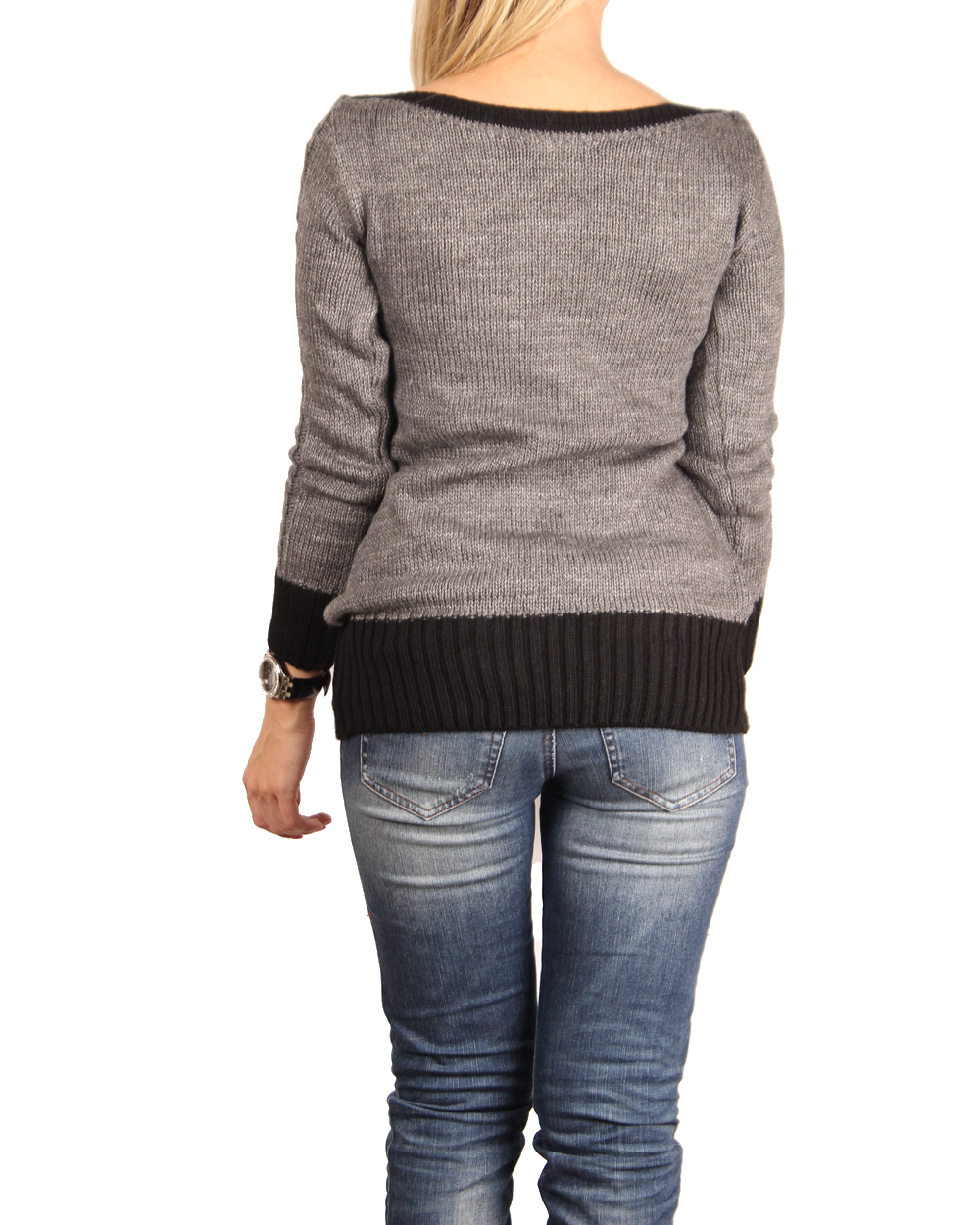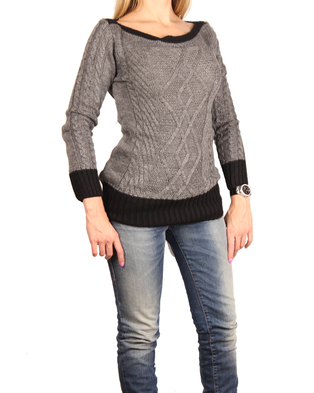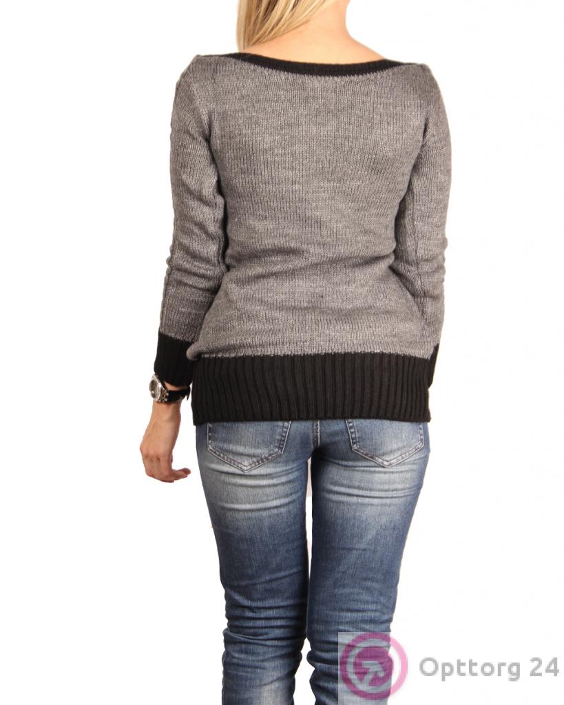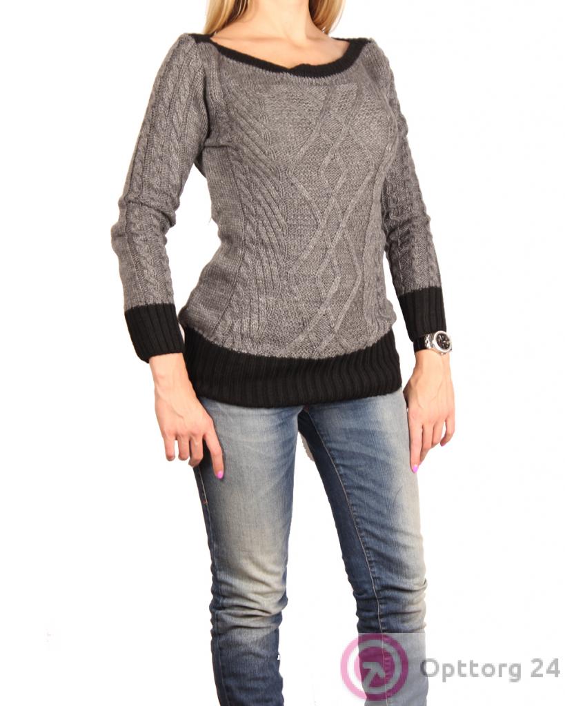 Вязаный женский джемпер с округлой горловиной коричневого цвета. Рукава, низ и горловина отделаны черными вязаными резинками. Джемпер очень красиво смотрится за счет контрастной отделки и необычной вязки.