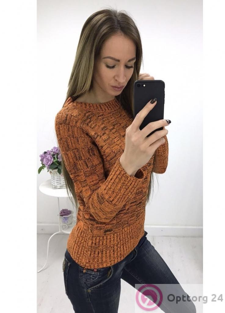 Оранжевый женский джемпер с красивым шахматным узором. Отличное яркое изделие привлекающее к себе внимание. Имеет округлый ворот и короткий фасон
