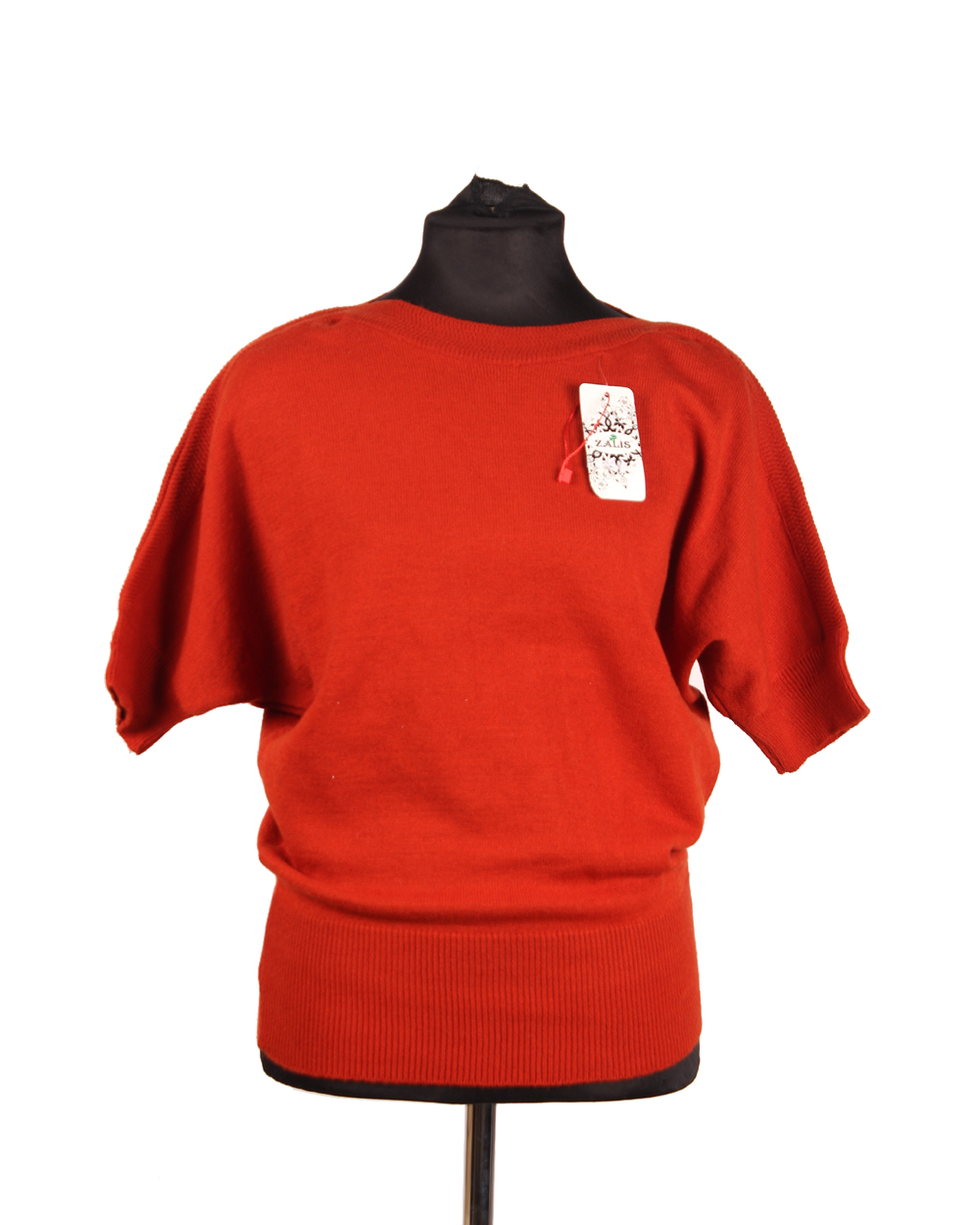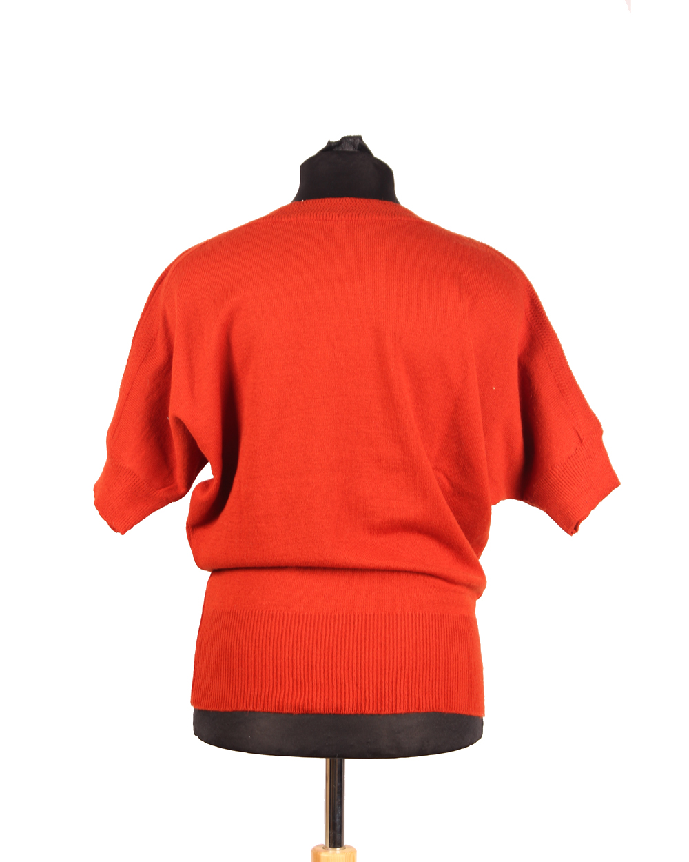 Очень красивый вязаный джемпер оранжевого цвета. Модель свободного пошива, с короткими рукавами. Внизу изделия широкая эластичная резинка, хорошо садится по фигуре. Горловина овальной формы, неглубокая. Отличное дополнение к гардеробу.