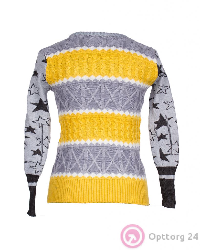 Джемпер женский с декором "звёздочки" на рукавах серый с жёлтую полоску купить оптом
