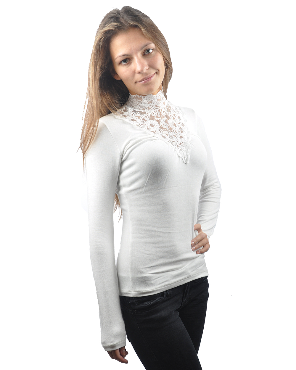 Простой и аристократичный белый цвет прекрасно дополняет необычный покрой этого джемпера. Ажурный ворот, аккуратно очерчивающий шею, привносит в образ немного игривости.