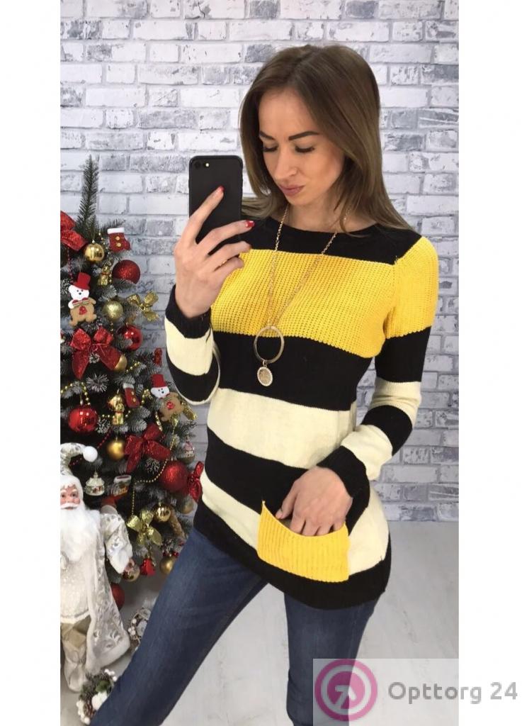 Яркий и стильный женский джемпер желтого цвета с белыми и черными полосками. Изделие радует своей летней расцветкой и прекрасно утепляет в холодный зимний период. Имеет практичный карман спереди