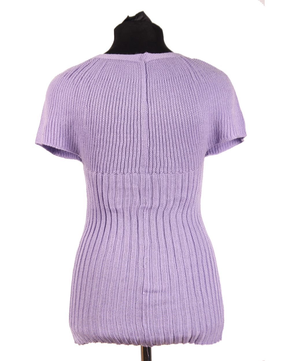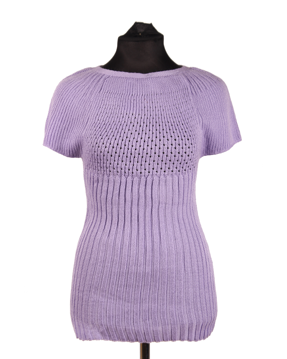 Очень красивый вязаный женский джемпер с короткими рукавами. Модель с двумя типами вязки, приталенный силует. Джемпер имеет округлую горловину. Отлично смотрится с тонкими гольфами или отдельно в комбинаии с брюками и юбками.