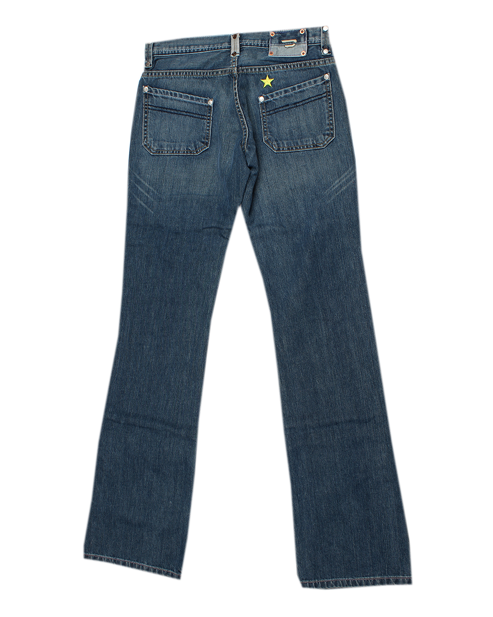 Оригинальные женские джинсы синего цвета. Прямой крой, накладные карманы спереди.