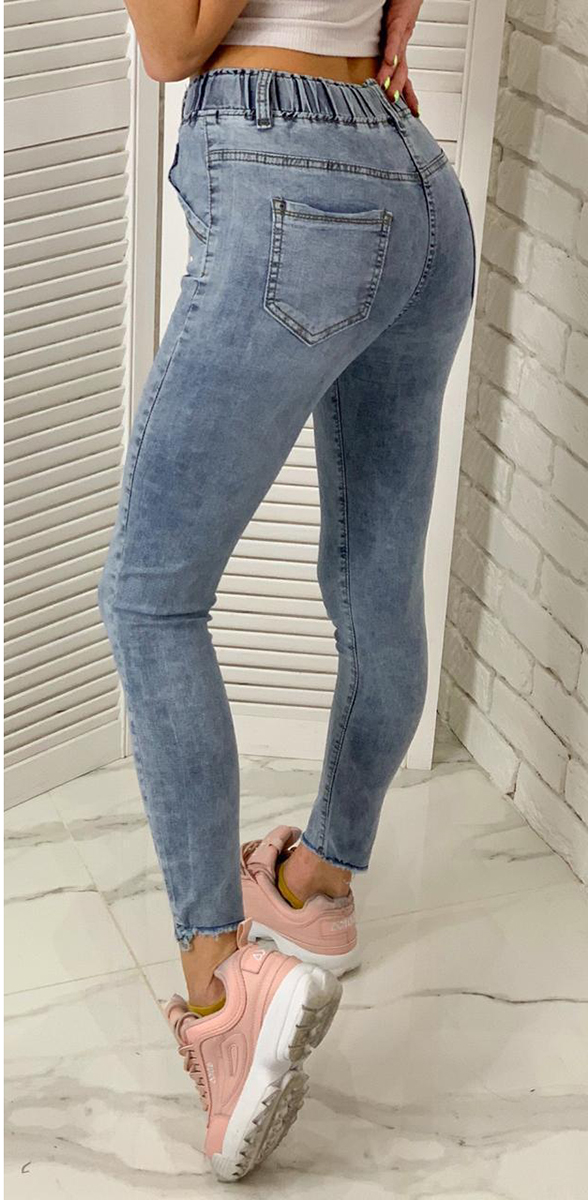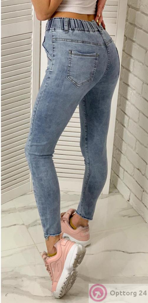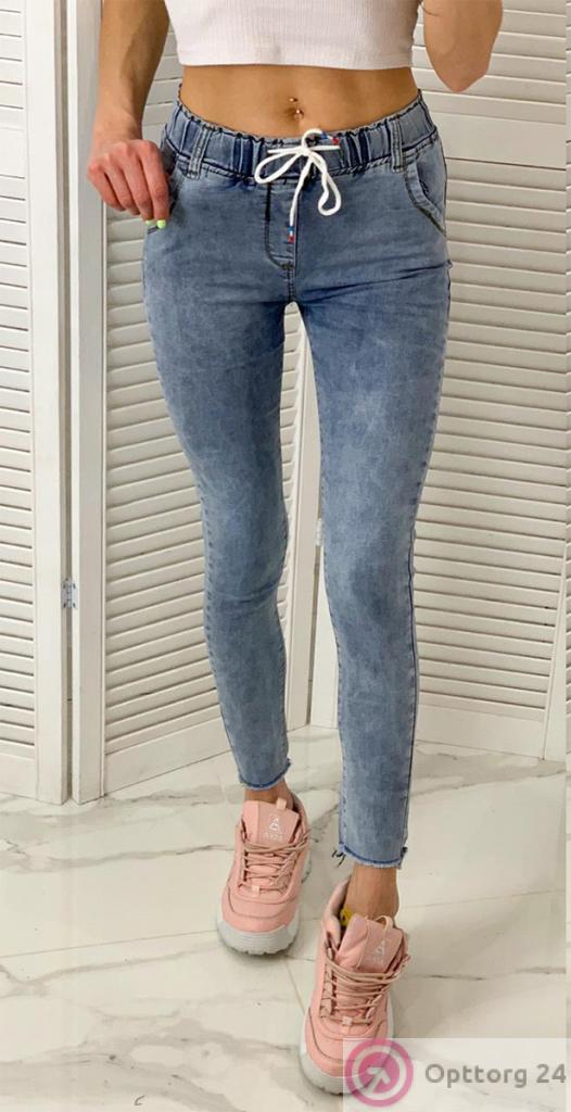 Описание: Джинсы женские голубого цвета, обтягивающие. Эффект варенки. Обрезанный низ брючин. Пояс на резинке и на шнурке. Есть четыре кармана.