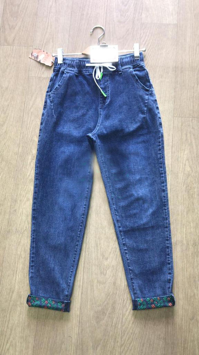 Описание: Джинсы женские на резинке синего цвета с вытачками возле карманов. Зауженные к низу. Декорированы белым шнурком на талии. Есть карманы.