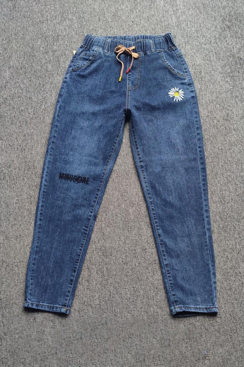 Описание: Джинсы женские на резинке синего цвета с принтом ромашки и надписью на колене. Заужены к низу. Декорированы шнурком на талии. Есть карманы.