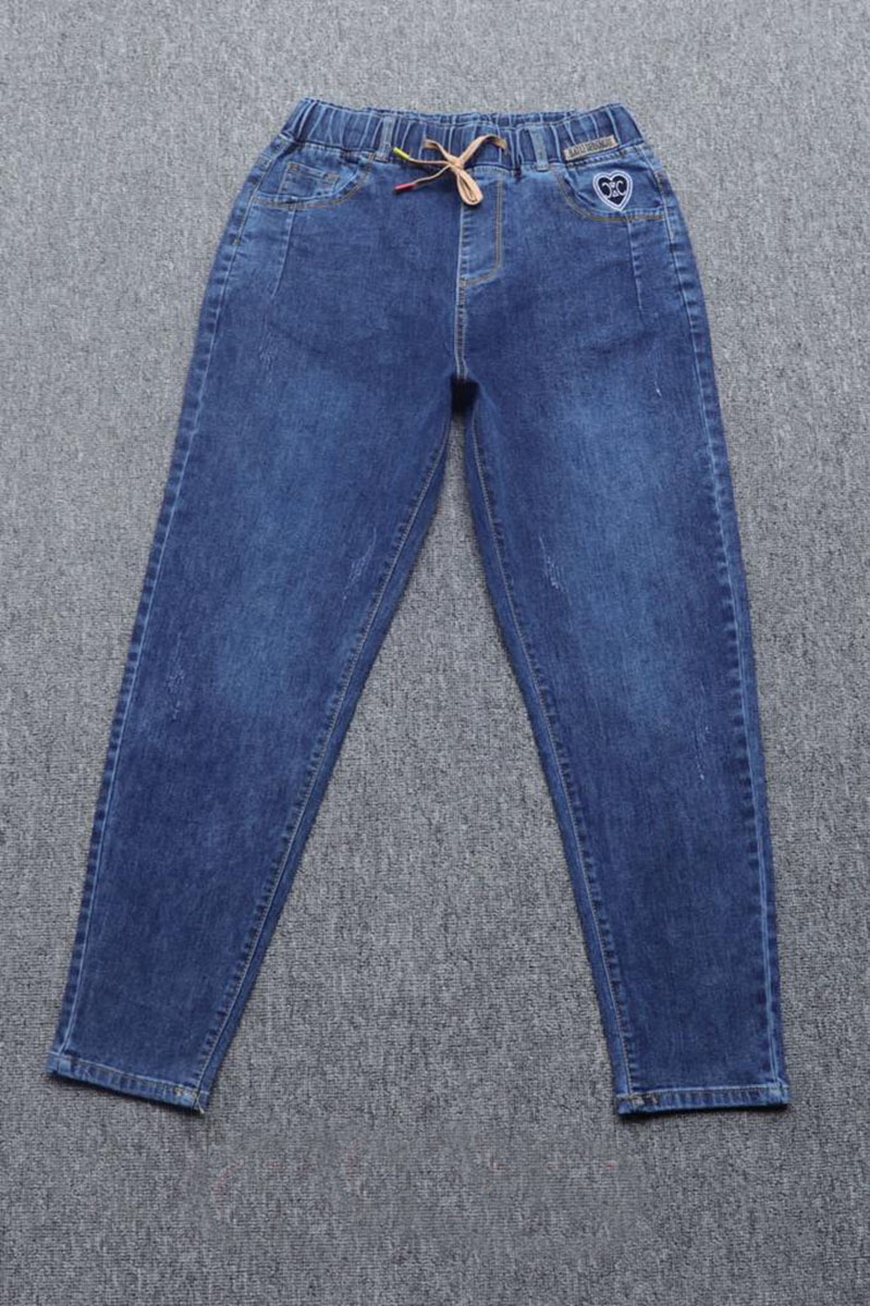 Описание: Джинсы женские на резинке синего цвета с принтом сердечка и вытачками на карманах. Заужены к низу. Декорированы шнурком на талии. Есть карманы.