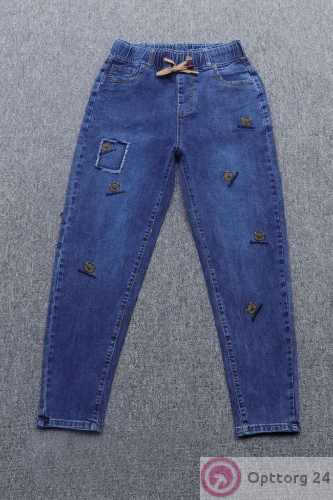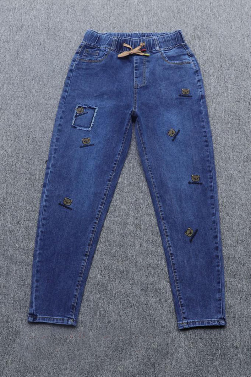Описание: Джинсы женские на резинке синего цвета с заплаткой на брючине и принтом мишек. Заужены к низу. Декорированы шнурком на талии. Есть карманы.