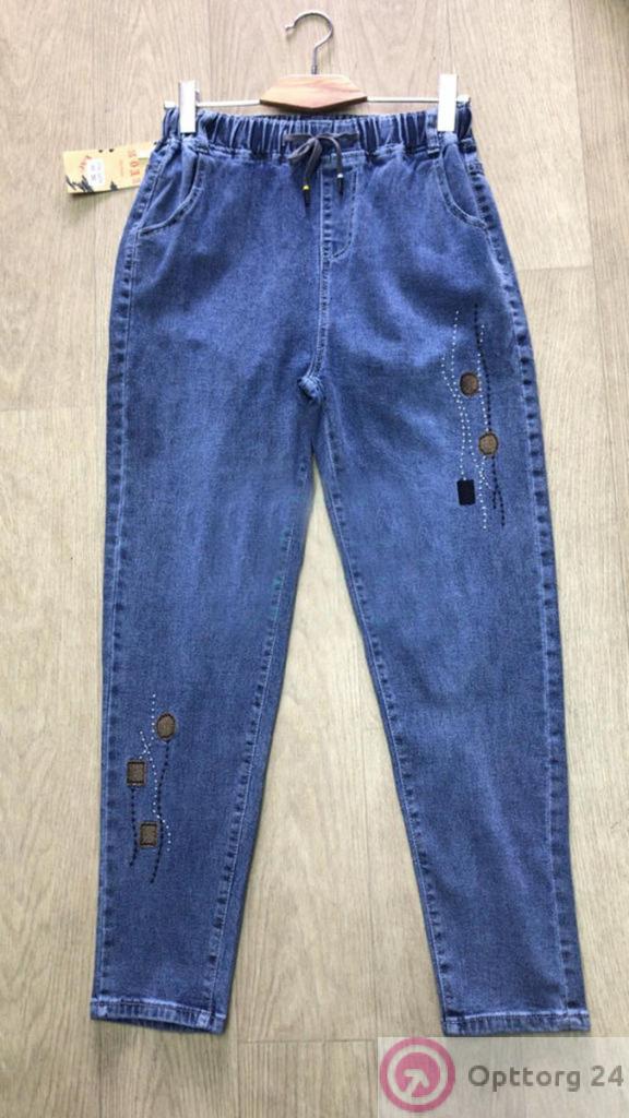 Описание: Джинсы женские на резинке синего цвета с принтом на штанинах и небольшими потертостями. Заужены к низу. Декорированы шнурком на талии. Есть карманы.