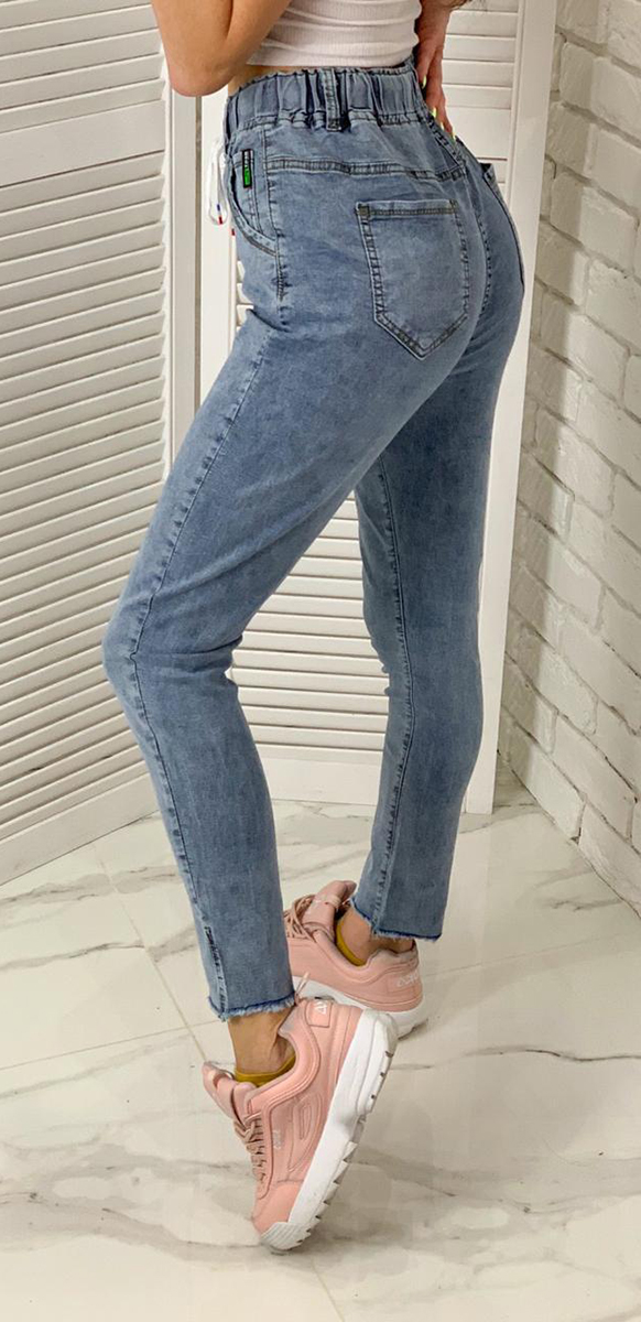 Описание: Джинсы женские голубого цвета, обтягивающие, с высокой талией. Эффект варенки. Низ брючин обрезан. Пояс на резинке и на шнурке. Есть четыре кармана.