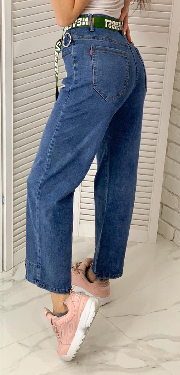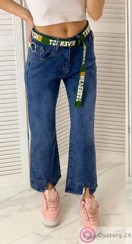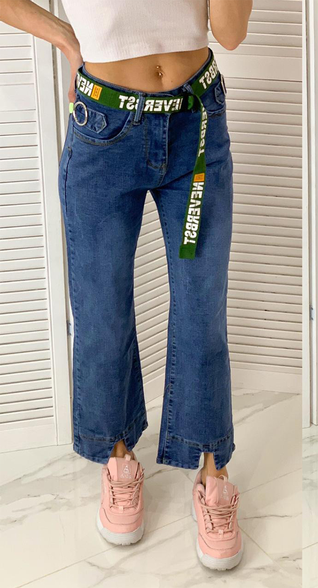 Описание: Джинсы женские синего цвета, с небольшими потертостями, расклешенные к низу, с высокой талией. С зеленым поясом. Снизу брючин спереди разрезы. Застежка на пуговице и молнии. Есть шлевки под ремень. Есть четыре кармана.