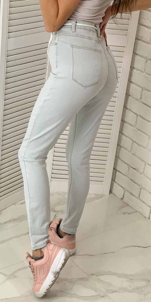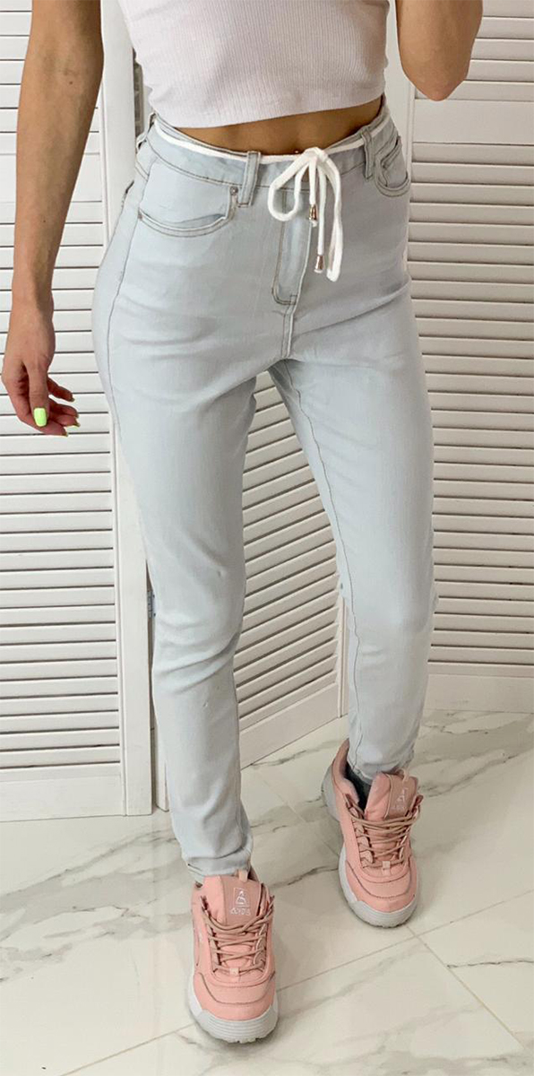 Описание: Джинсы женские серо-голубого цвета, зауженные, с высокой талией, на поясе белый шнурок. Застежка на пуговице и молнии. Есть шлевки под ремень. Есть четыре кармана.