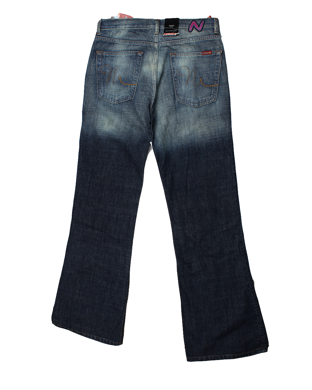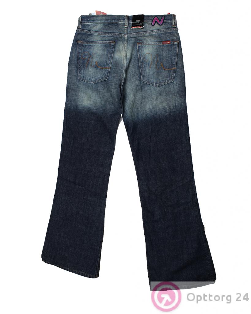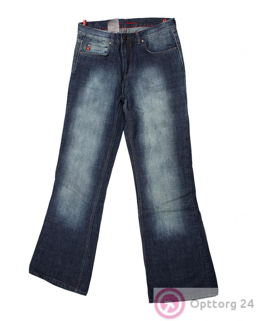 Оригинальные джинсы темно-синего цвета с сильно высветленными фрагментами. Широкие брючины.